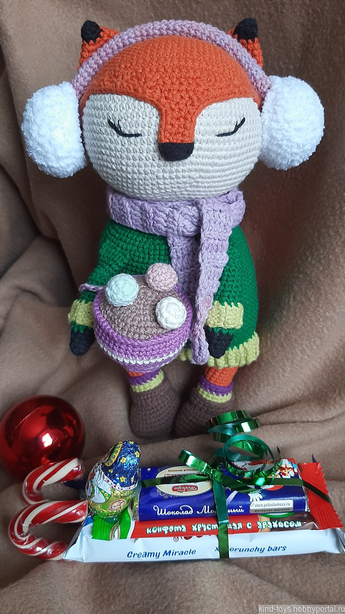 Лисичка Милли связана из полухлопка, наполнитель халофайбер. Рост 29 см. Наушники, шарфик, чашечка с какао и маршмеллоу снимаются.