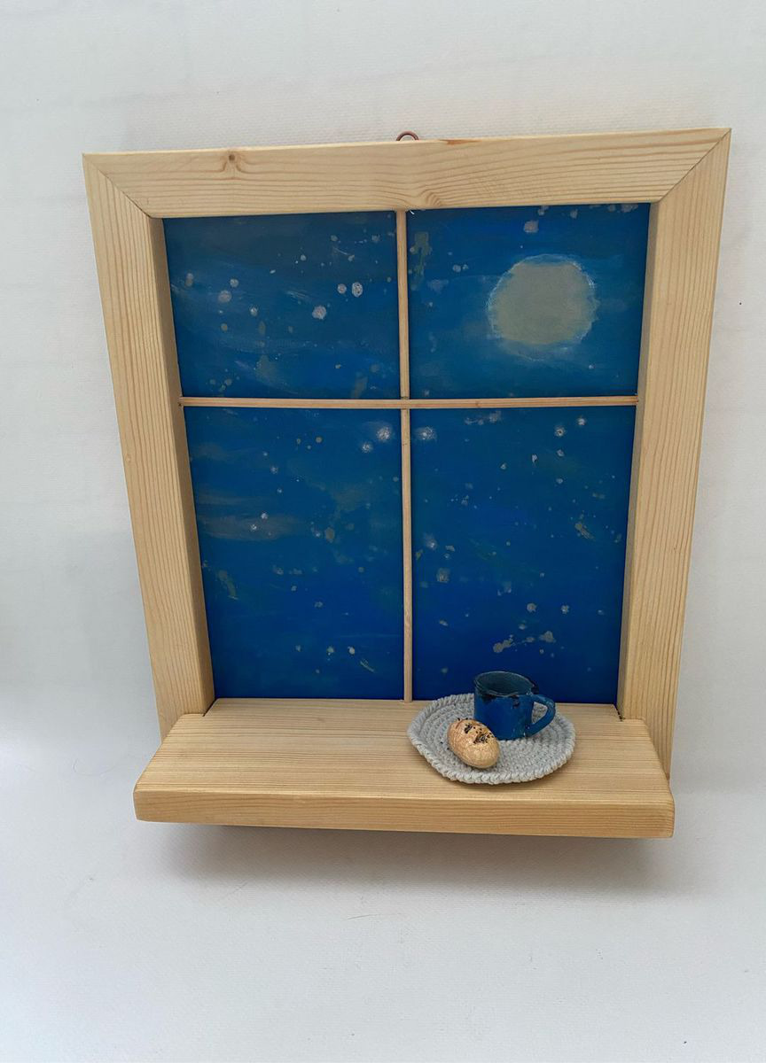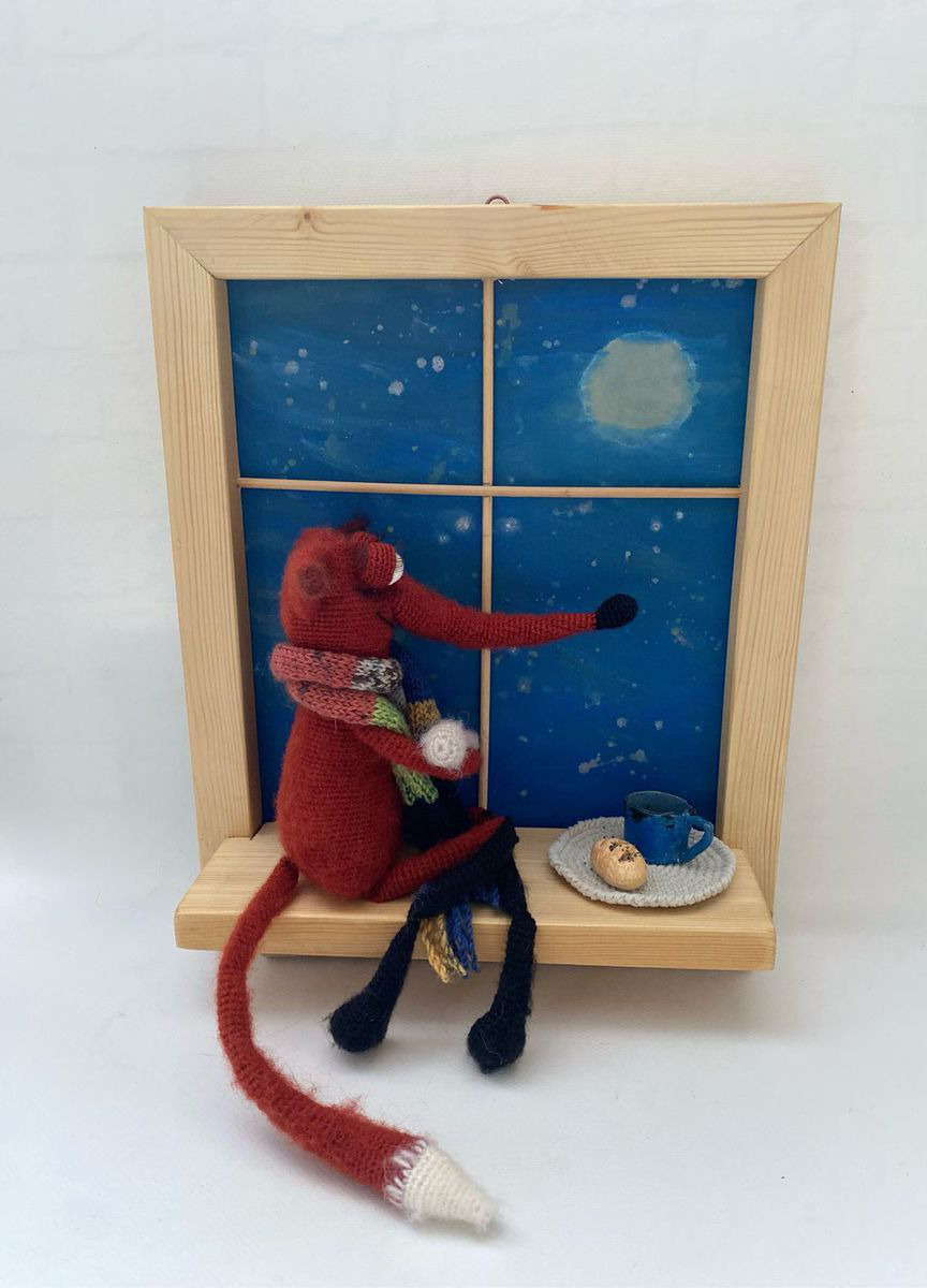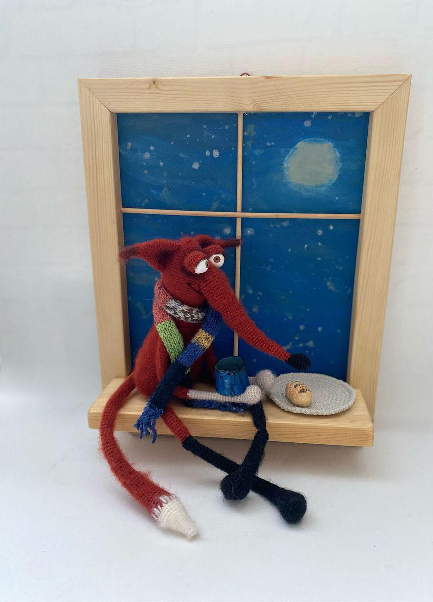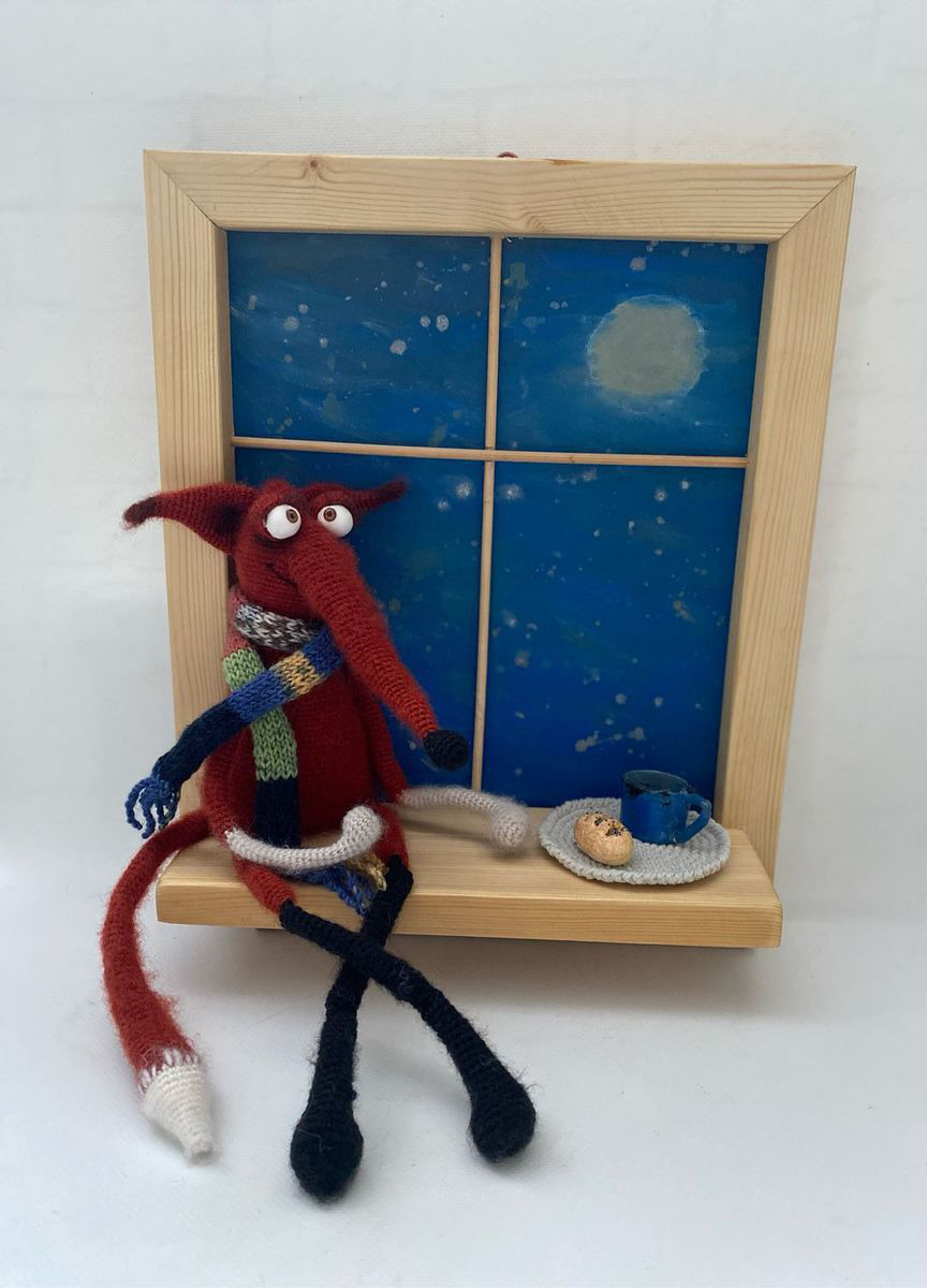 (Лисик готов переехать вместе с окном (можно повесить на стену), булочкой и кружкой. Размер окна 30х35, лисенок сидя 16 см, вся длина лисенка вместе с лапками 37 см, в носике и в ручках проволочный каркас, булочка и кружка из глины, глазки лисенка полимерная глина)