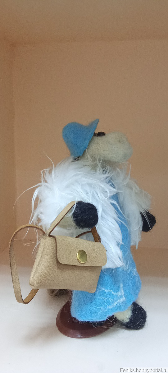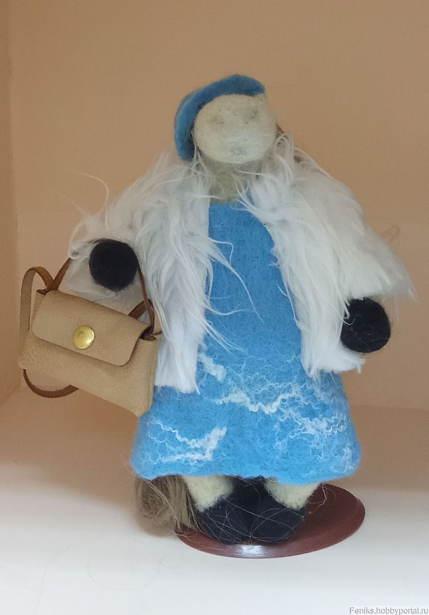 Игрушка сваляная из натуральной шерсти, грива и хвост искусственные волосы, глаза приклеены, есть ресницы, одета в валяное платье из голубой шеости с добавлением искусственного волокна белого цвета, в короткую шубку из искусственного меха, держит сумочку, на голове голубая валяная шляпка в тон платью. Размер 23 см.
