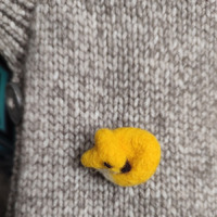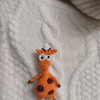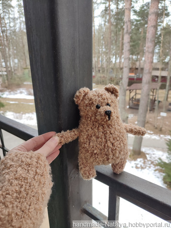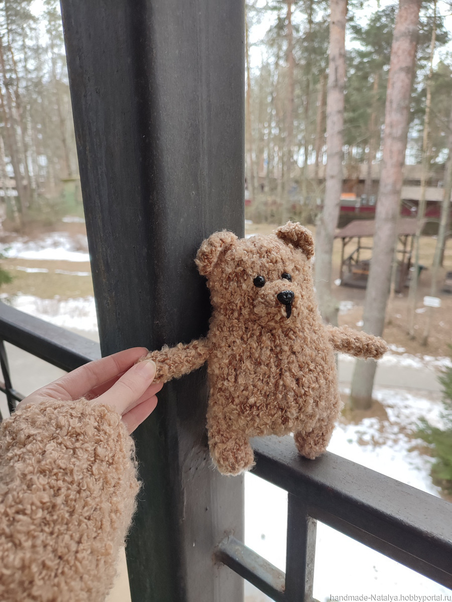 Вязаный мишка из букле, высота около 18.5 см, ширина с растопыренными лапами примерно 17.5 см (в самой широкой части туловища без учёта верхних лап - около 10 см), глазки и носик на креплениях, набит синтепухом.
