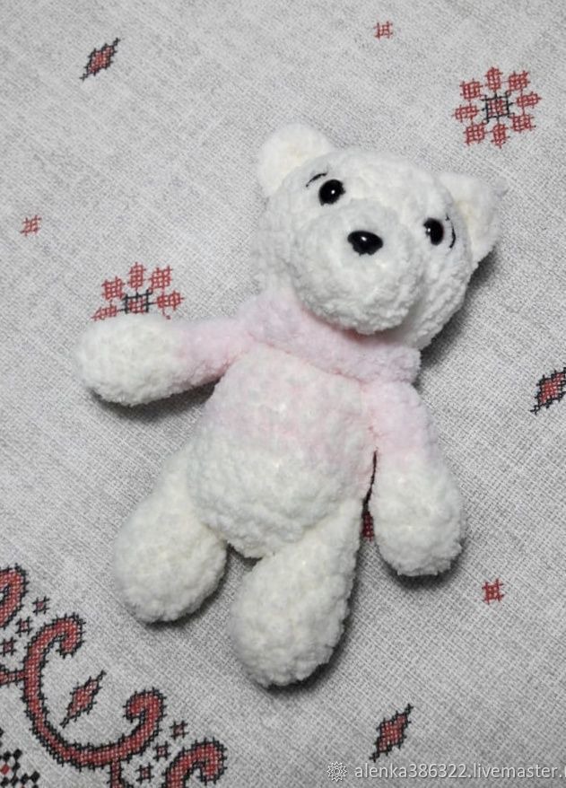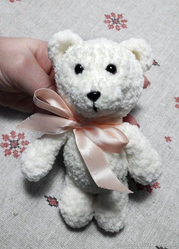 Медвежата выполнены из плюшевой пряжи турецкого производителя.Очень приятные на ощупь. Порадуют как малышей,так и взрослых.Глазки на безопасном креплении,можно смела давать самым маленьким деткам.Рост медвежонка 17см. Очень удобно деткам брать плюшевого друга с собой на прогулку и в детский сад.