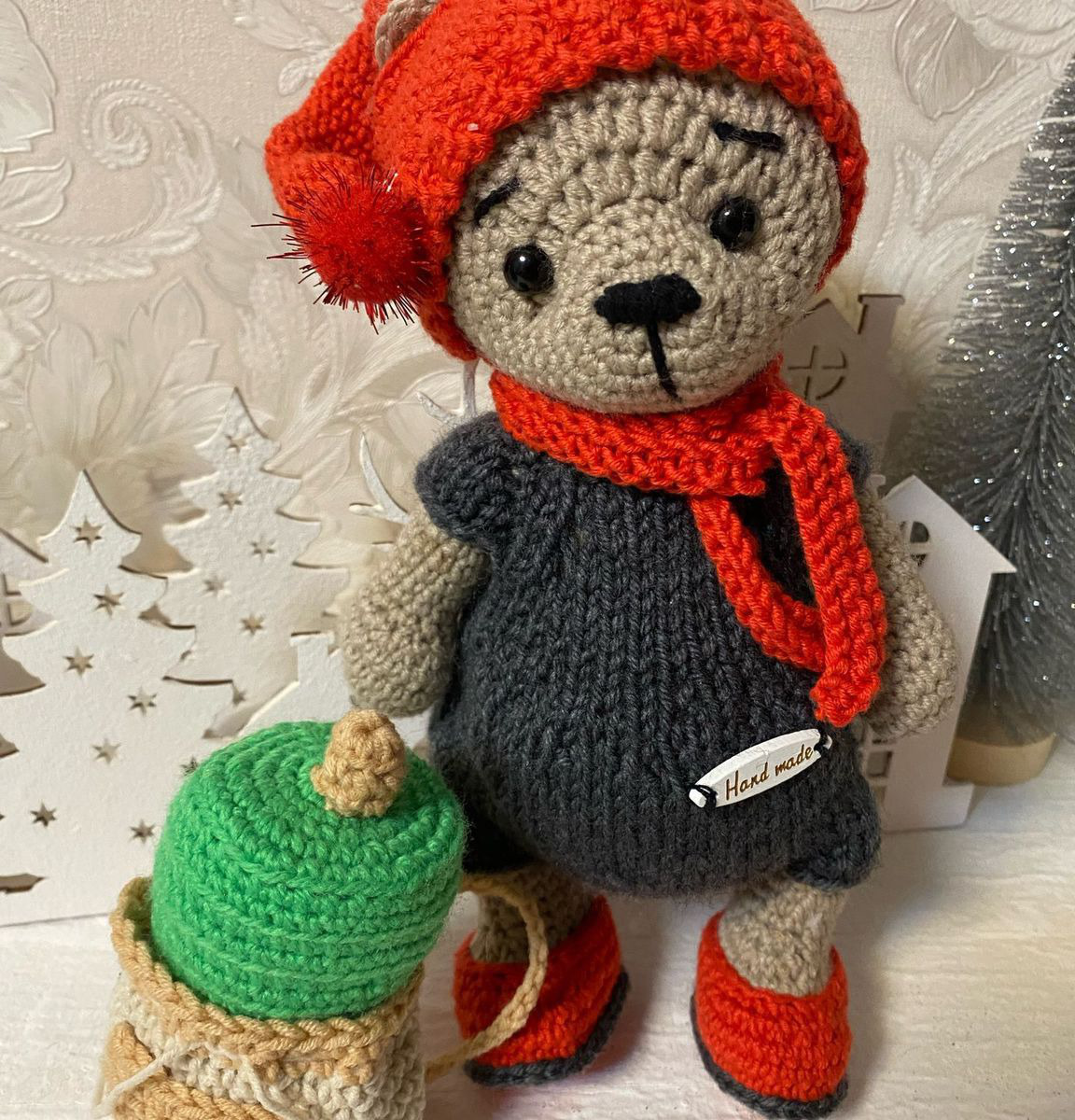 Мишутка связан из пряжи хлопок+акрил, наполнитель синтепон. У минутки снимаются обувь и шапка. В комплекте идёт рюкзак и ёлка.