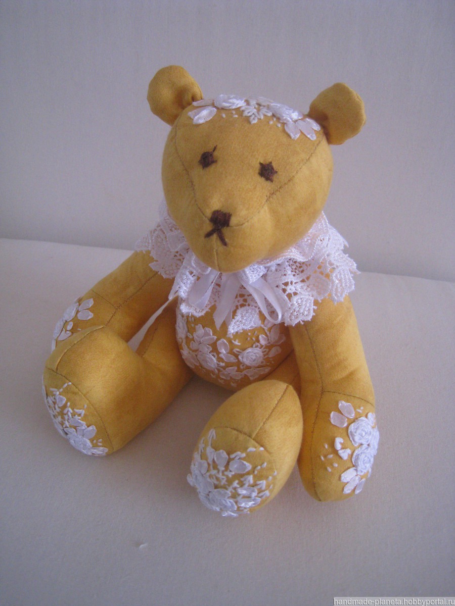 Замечательный и добрый мишка выполнен из хлопка желтого цвета.