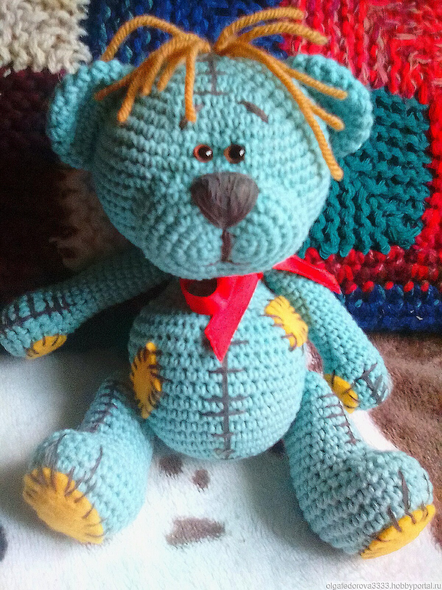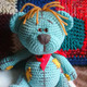 Медвежонок , связан крючком . Рост 20 см , ножки подвижны , глазки для игрушек . Наполнитель для игрушек .