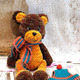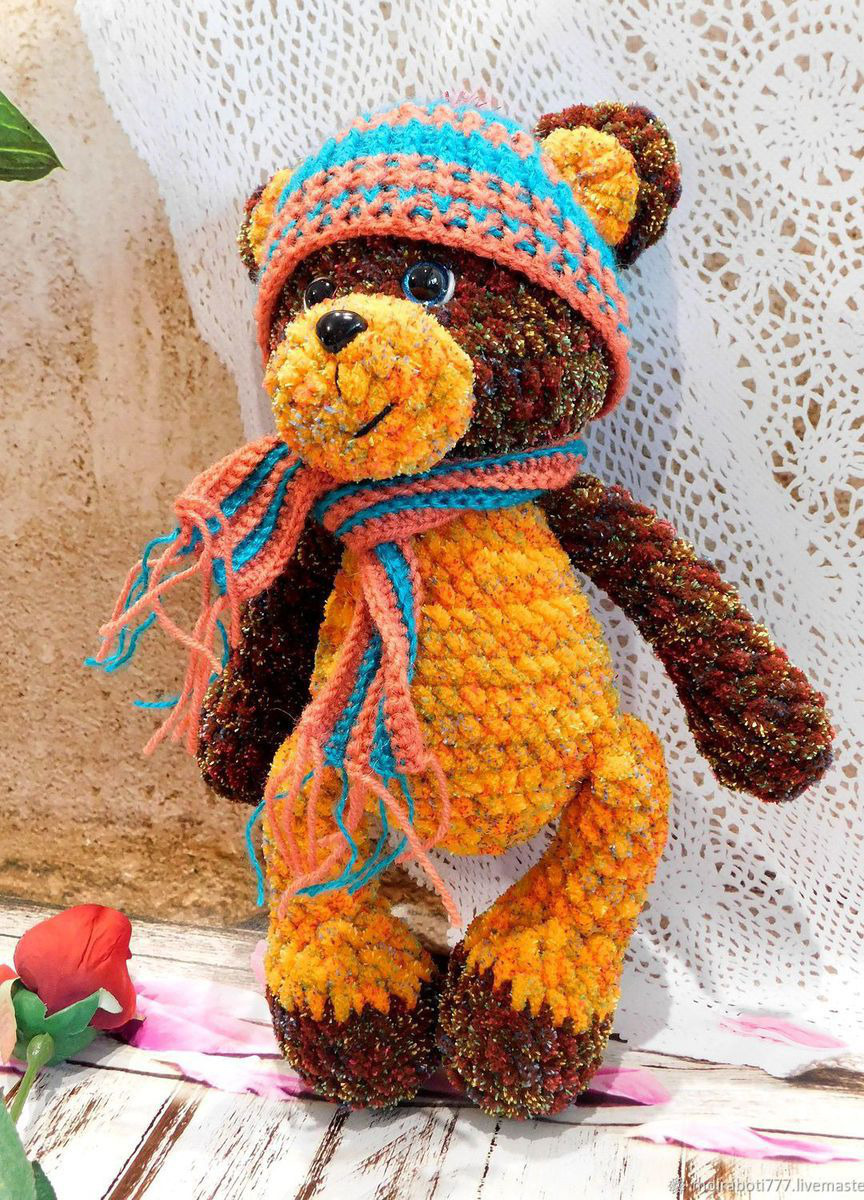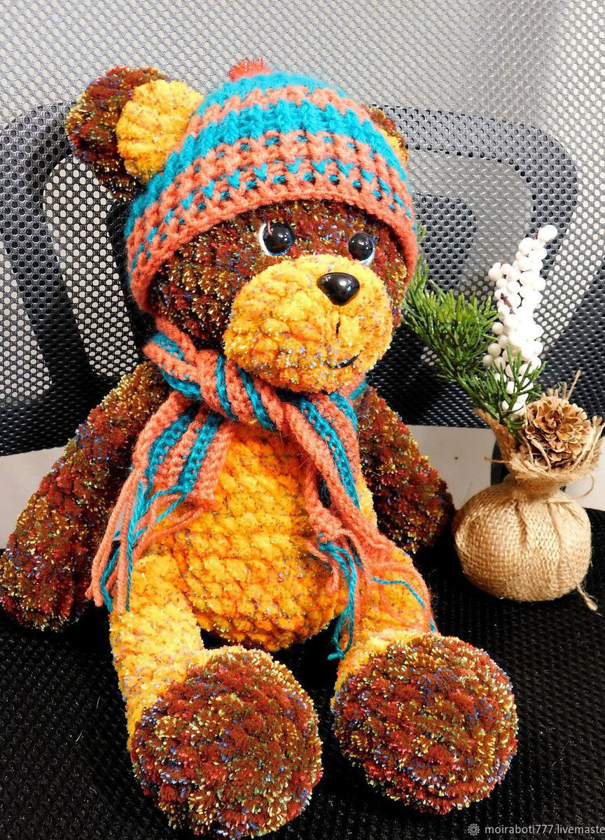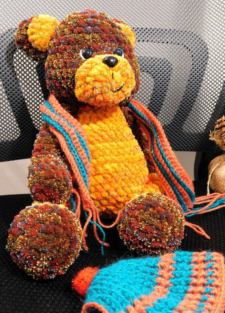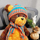 Мишка связан из пушистого полиэстера, шапка и шарф - из полушерсти. Наполнитель - гипоаллергенный холлофайбер.