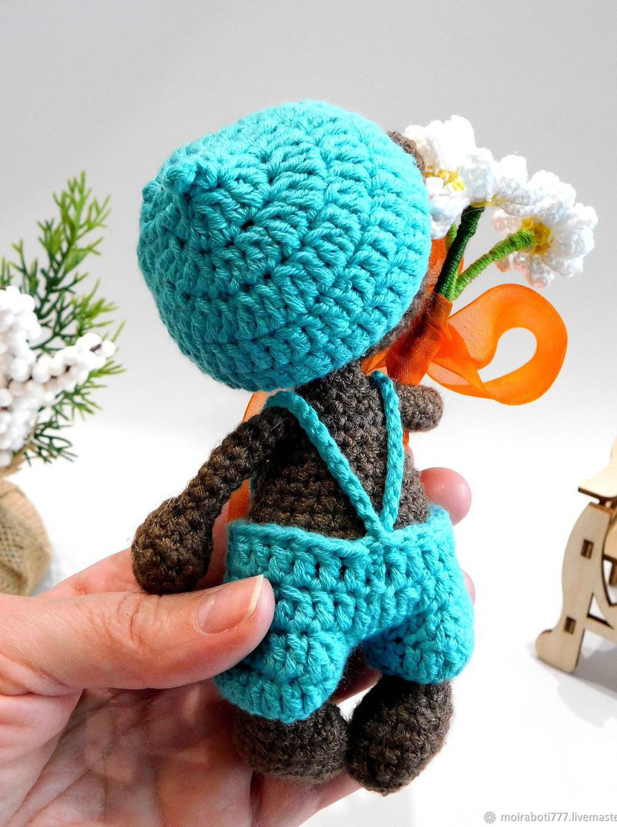 Маленький Мишка в шортах и кепке с букетом из трех ромашек связан вручную из мягкой акриловой пряжи.