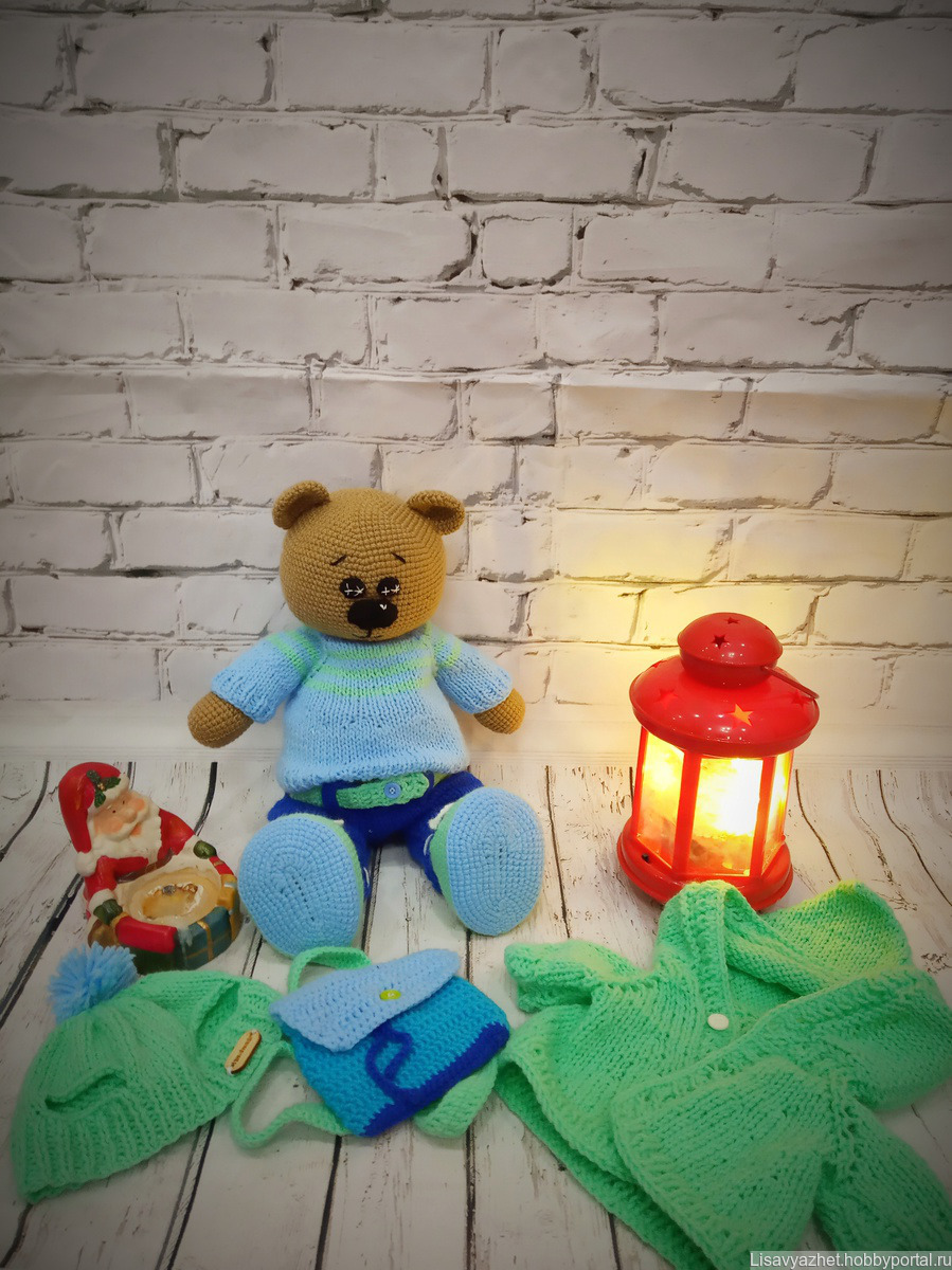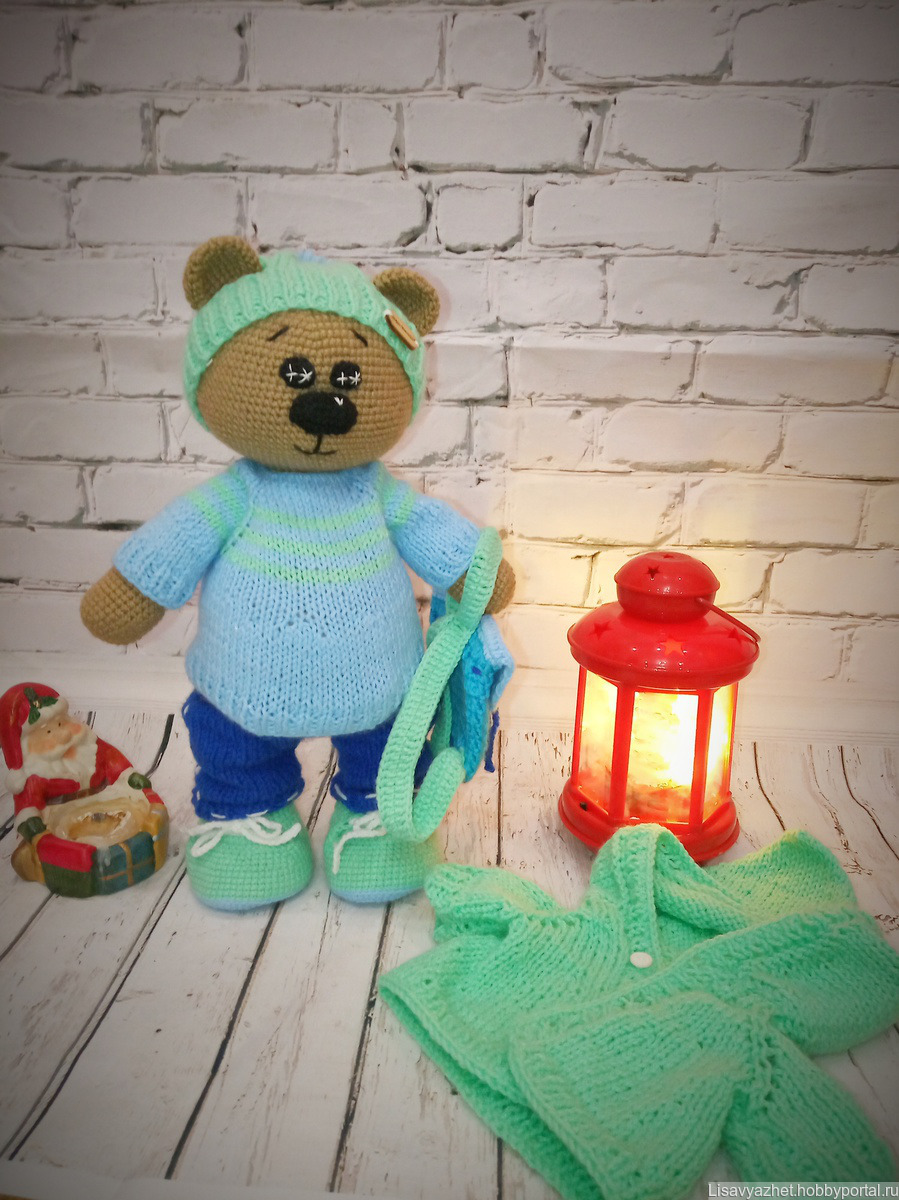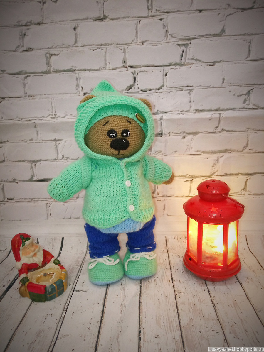 Вязаная игрушка Мишка Тильда выполнена вручную из гипоаллергенных материалов. Мишутка наояжен в модные джинсы с ремнем, кроссовки, шапочку , толстовку и курточку. Вся одежда и аксессуары снимаются и надеваются. Лапки подвижны, Мишутка может самостоятельно сидеть и стоять. Размер игрушки 33-34 см. Он мягкий, теплый и фактурный. Так и хочется обнять))