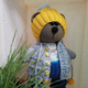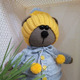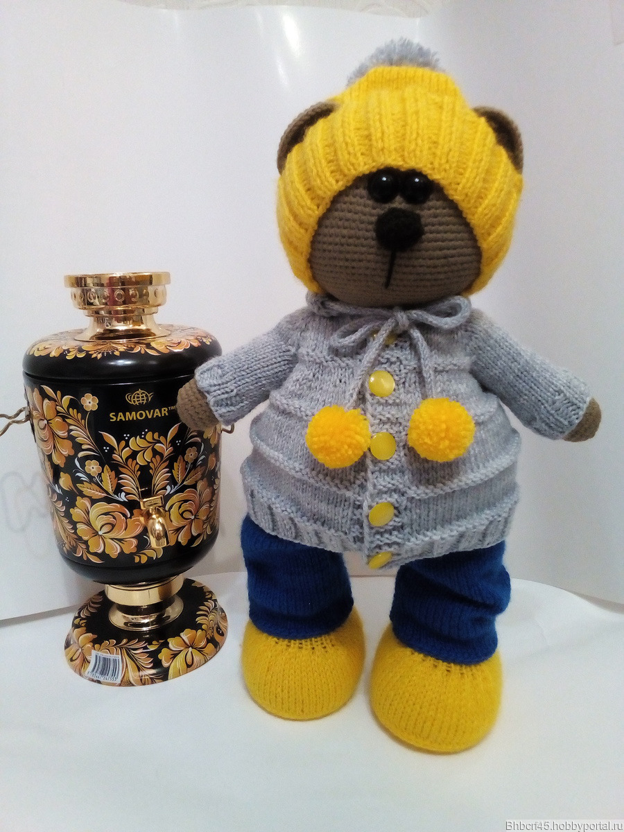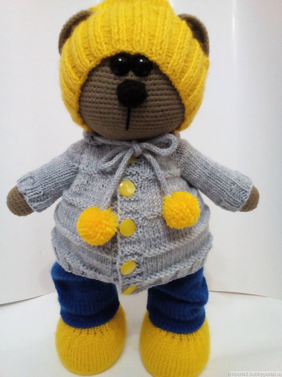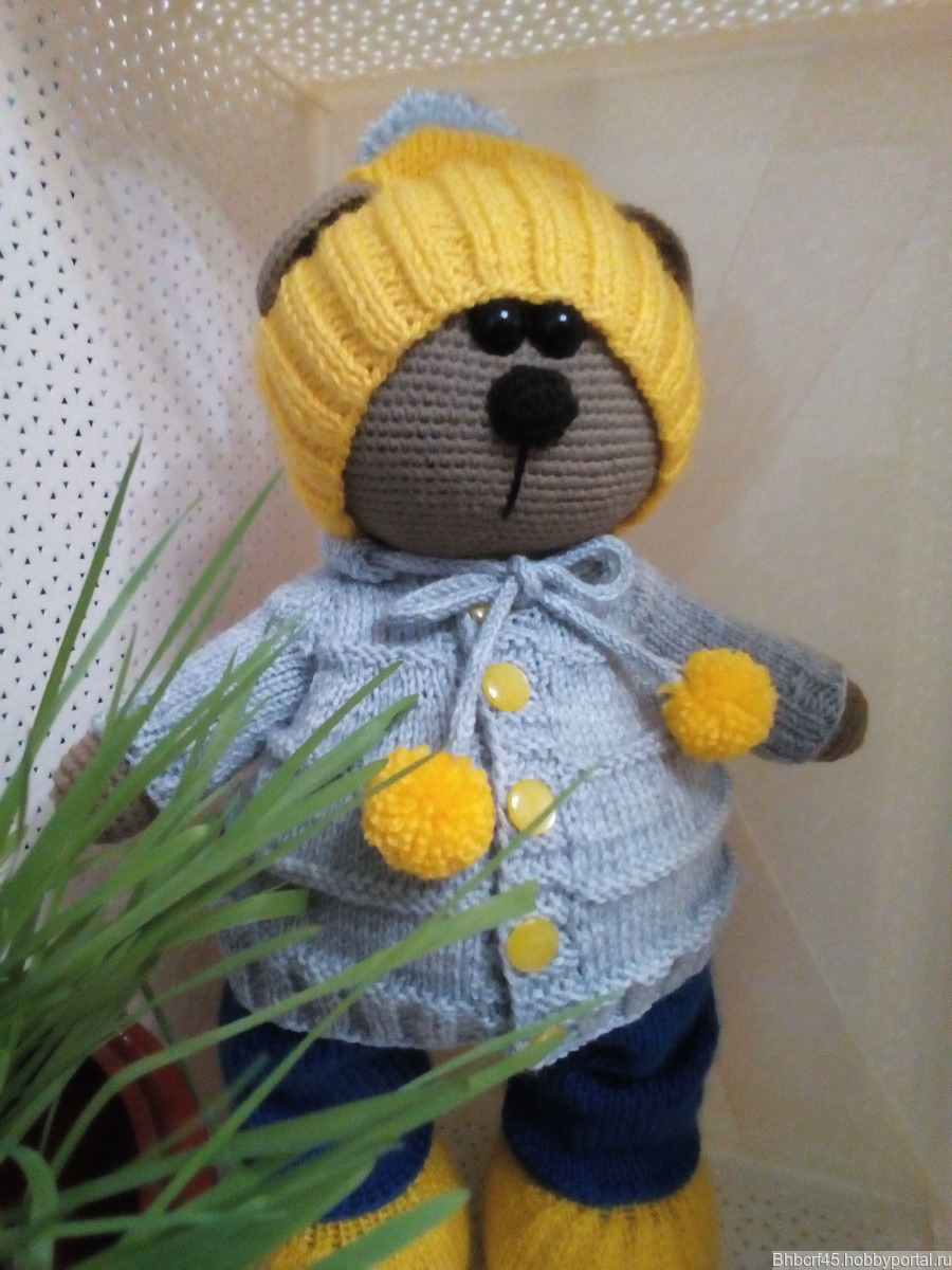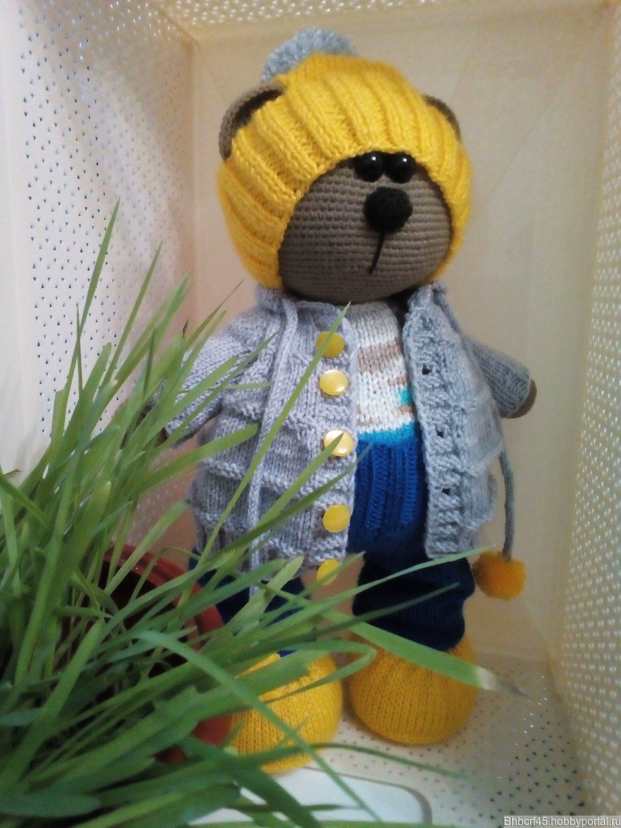 Мишка, предназначен как для игры детям, так и для подарка взрослым. Связан крючком из гипоаллергенной пряжи, ручки-ножки подвижны, самостоятельно стоит. Вся одежда снимается.