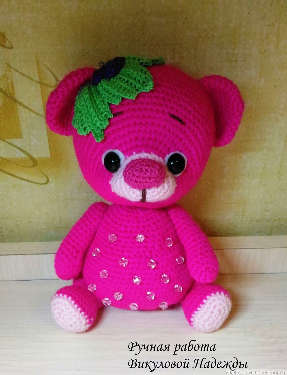 Вязаный Мишка Ягодка, выполнен из детского акрила, наполнитель синтепух, безопасные глаза, руки, ноги, голова подвижны.