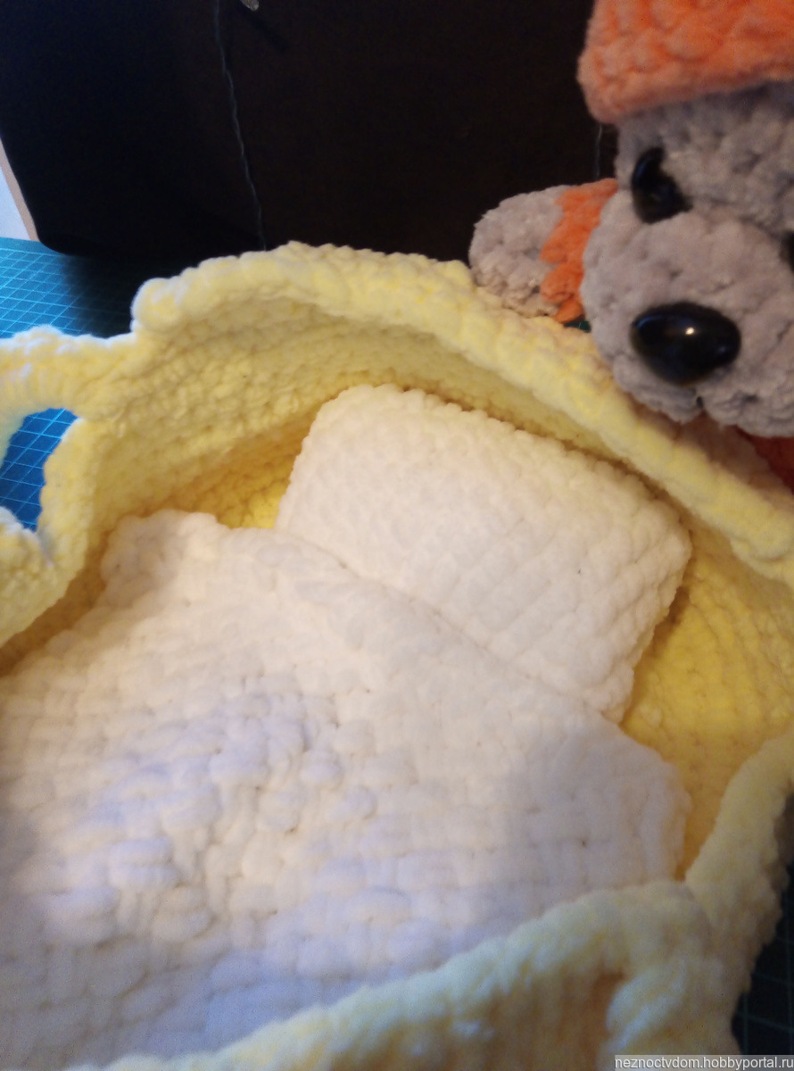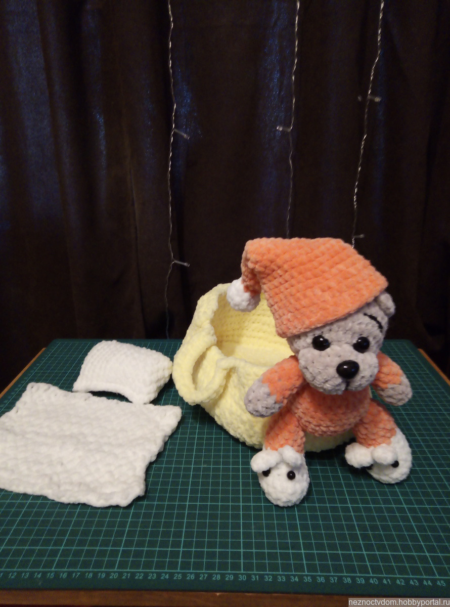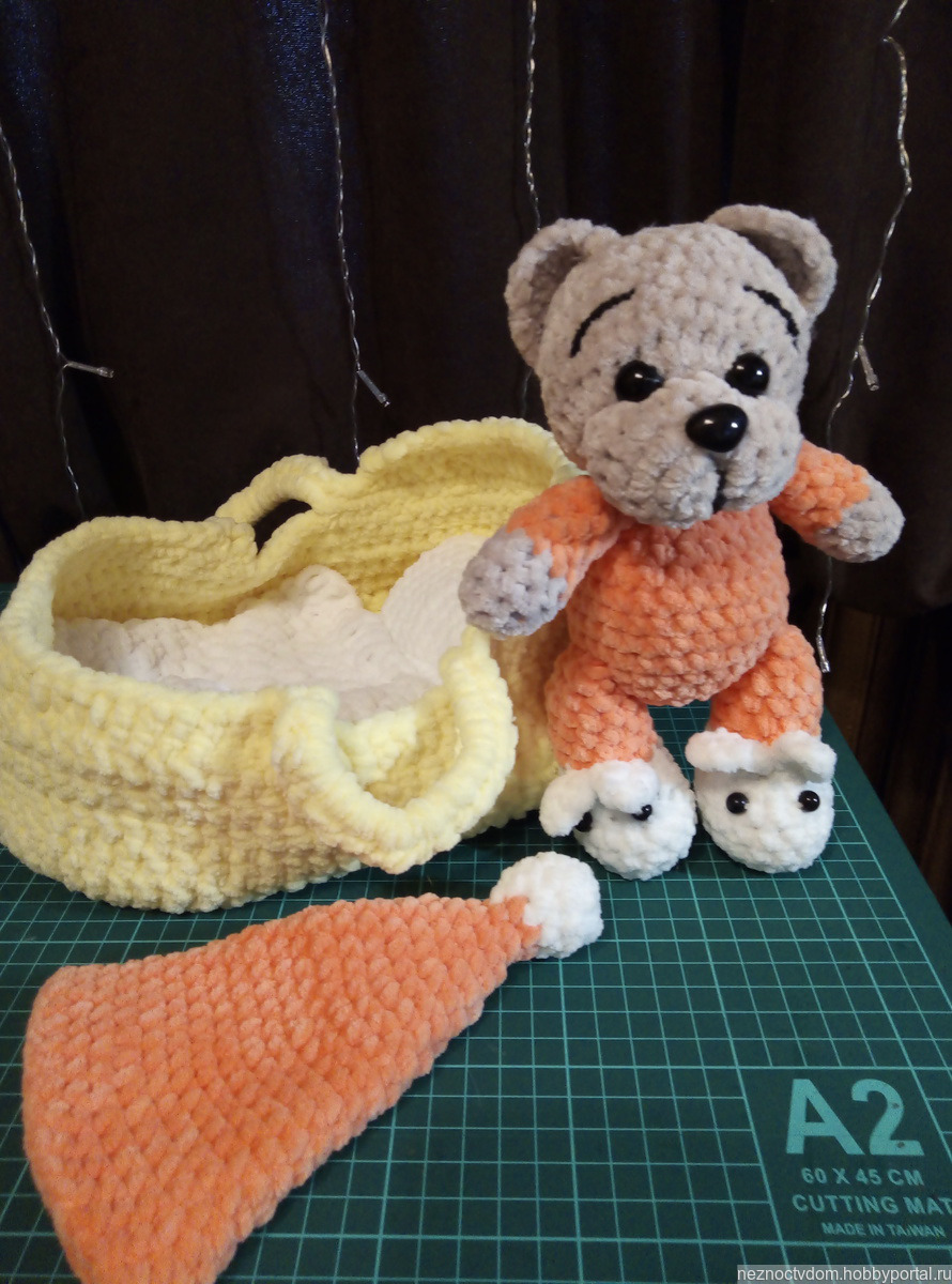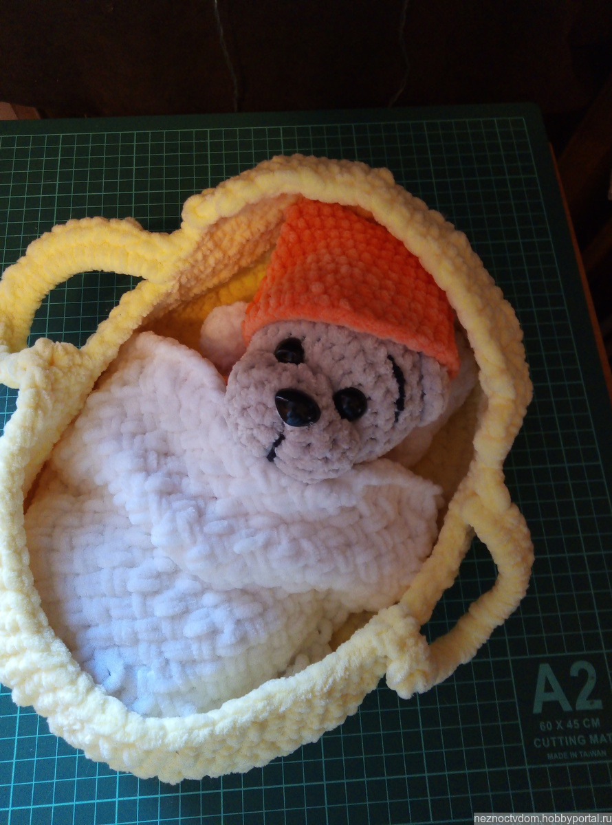 Комплект связан крючком из плюшевой пряжи, колпачок можно снимать/одевать, в люлечке есть подушка и одеялко. Наполнитель гипоаллергенный холлофайбер. Глазки и носик пластиковые на безопасном креплении.