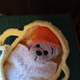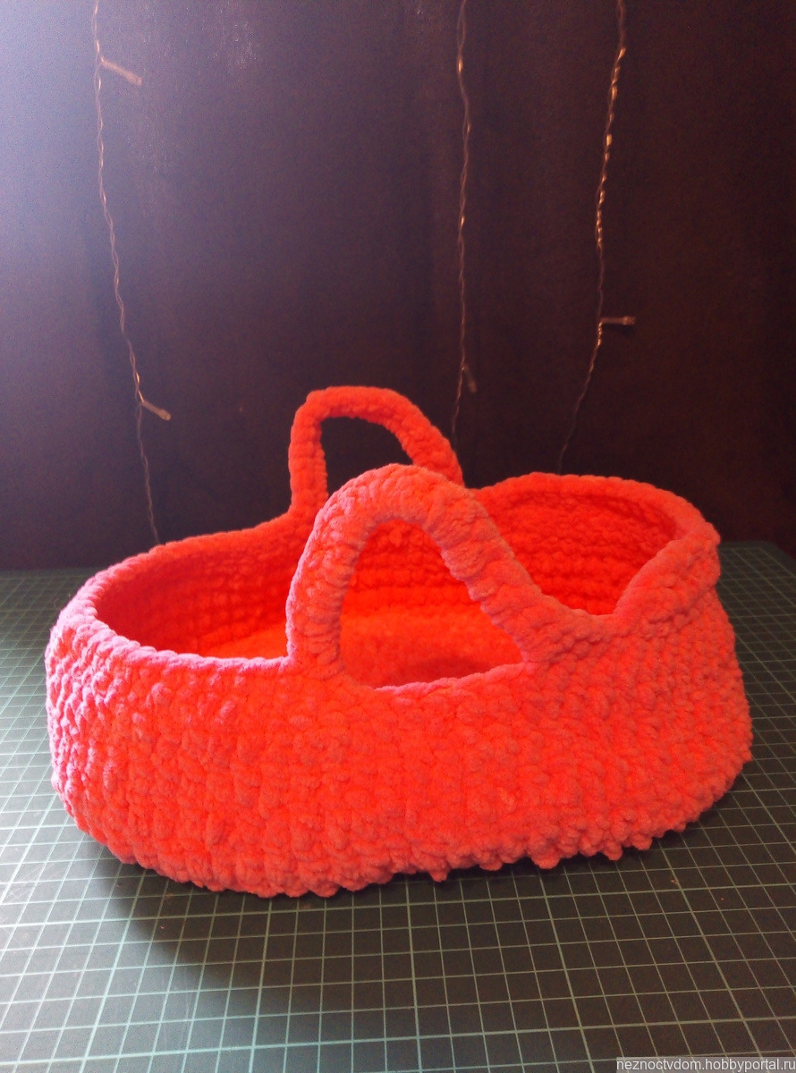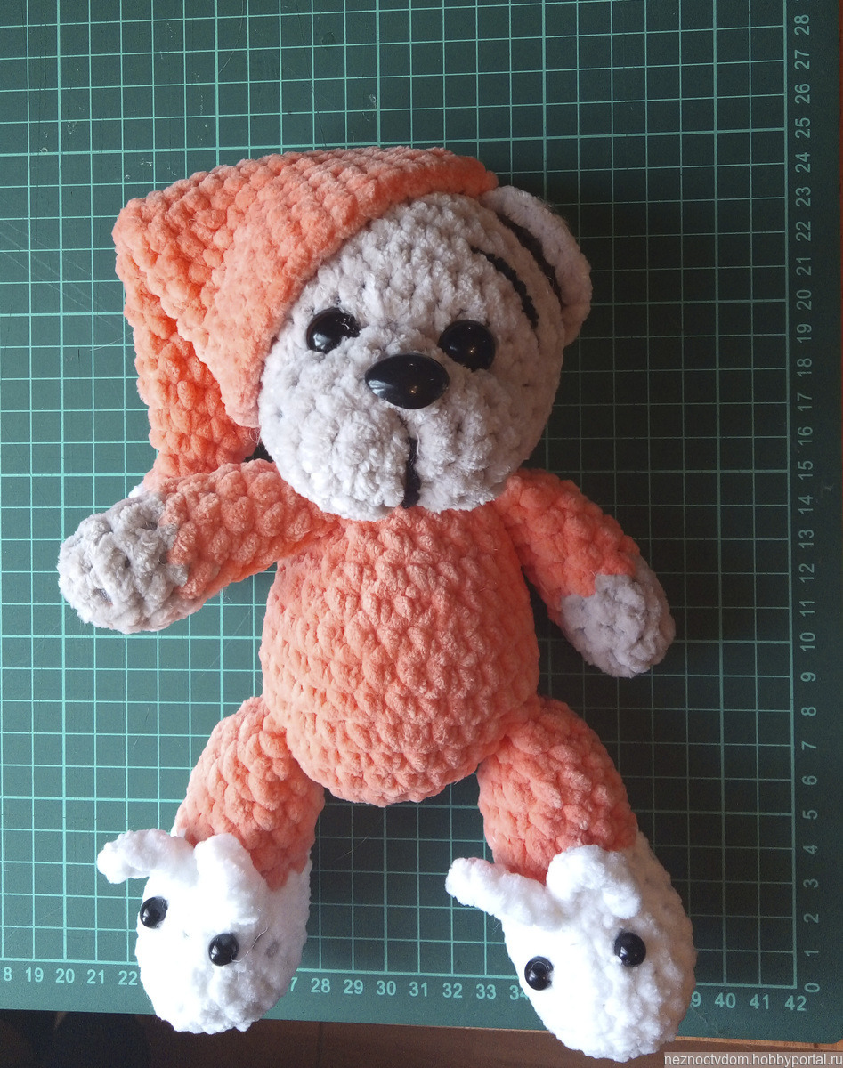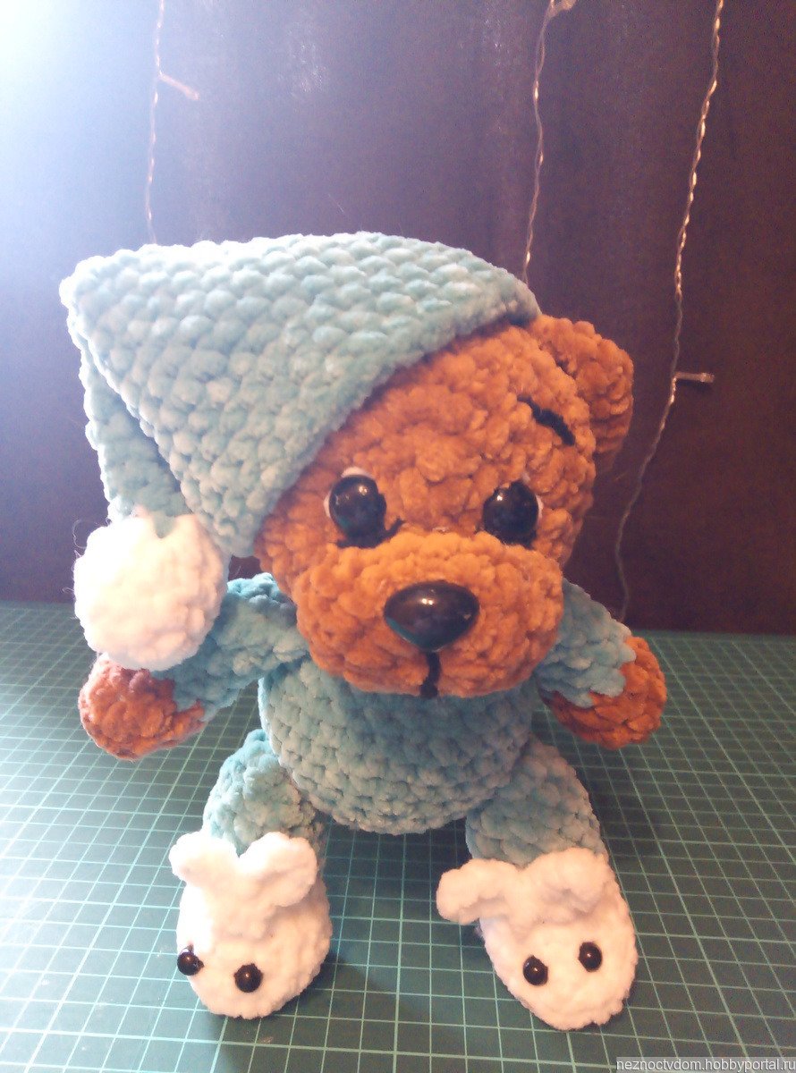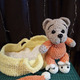 Комплект связан крючком из плюшевой пряжи, колпачок можно снимать/одевать, в люлечке есть подушка и одеялко. Наполнитель гипоаллергенный холлофайбер. Глазки и носик пластиковые на безопасном креплении.