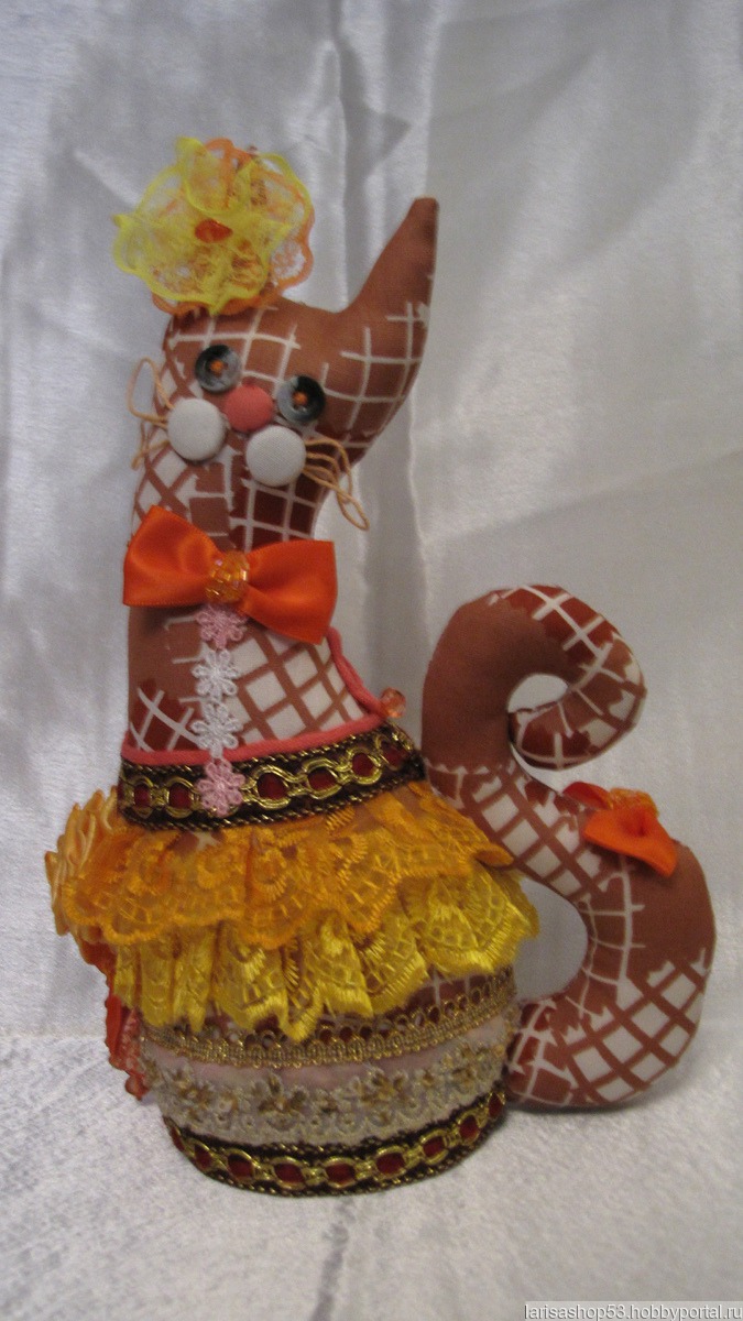 Милая кошечка для интерьера и для души, можно поиграть детям, так как все элементы декора надёжно пришиты. Набивка очень плотная, кошечка прекрасно стоит на поверхности. Авторская идея и работа. Оформлена кружевной тесьмой, декоративной тесьмой, декоративными элементами, пуговками, бантиками, шляпкой, цветком из атласной ленты.Ткань основы натуральный хлопок. Будет прекрасным подарком на любой случай или останется с Вами, чтоб радовать Вас каждый день.