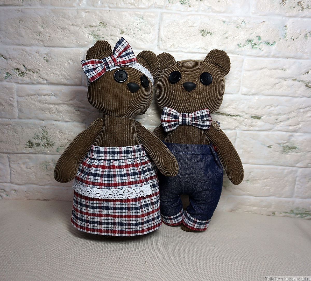 Технические подробности: рост около 23 см, сшиты из вельвета, вязанные детали - шерсть, наполнитель - синтепух. Стоят с опорой. Одежда снимается.