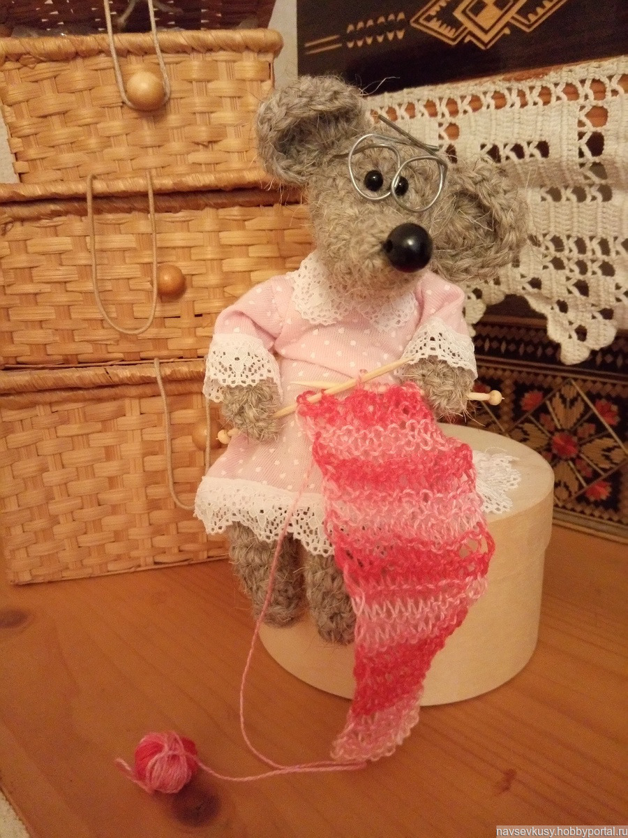 мышка связана крючком из деревенской пряжи,наполнитель вата, глазки и нос-бусины.Одета в трикотажное платье с кружевом,вяжет шарфик.Оригинальный новогодний подарок.Высота 10 см.
