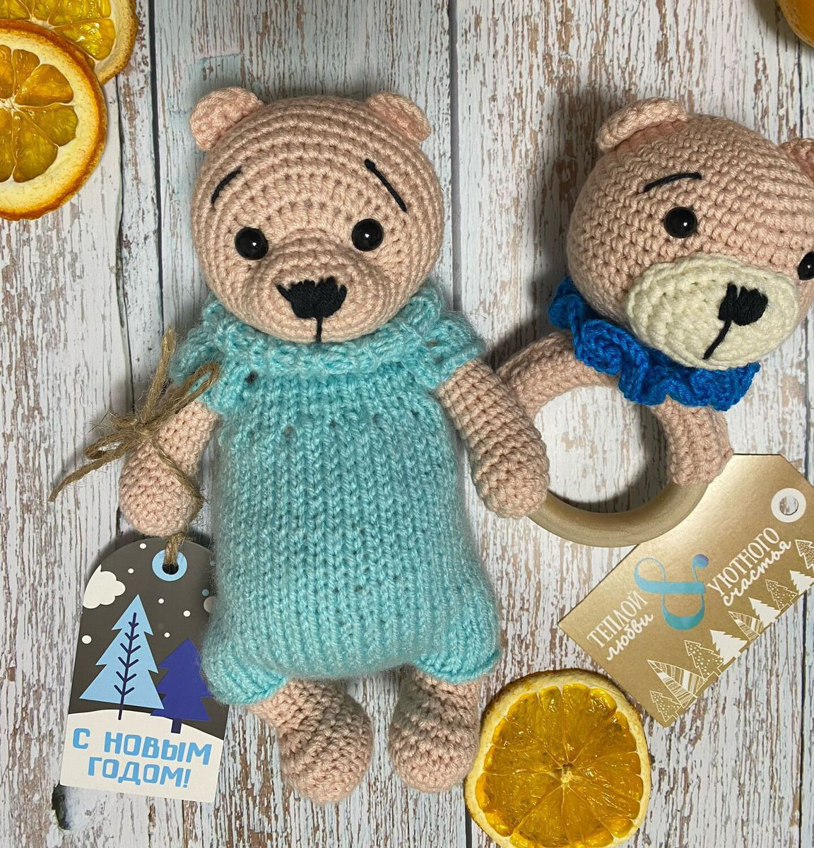 Набор игрушек связанных из детской хлопковой пряжи для самых маленьких. Глазки на безопасном креплении, наполнитель синтепон.