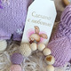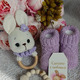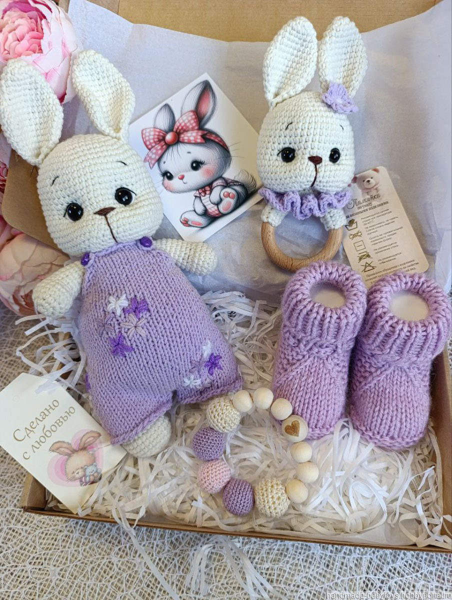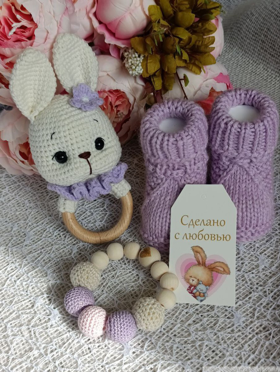 В набор входит игрушка зайчик (20 см), погремушка на буковом кольце,пинетки из полушерсти, грызунок из деревянных бусин