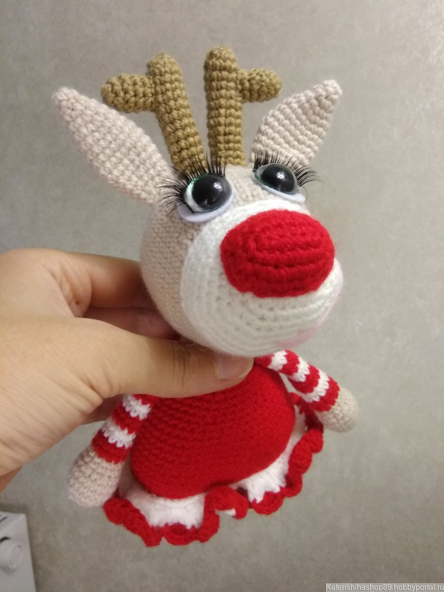 Игрушка выполнена из акриловой пряжи, наполнитель синтепон, глазки на безопасном креплении. Высота игрушки 24 сантиметра с учётом рожек.
