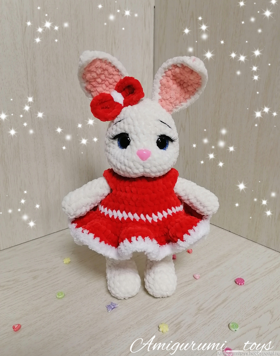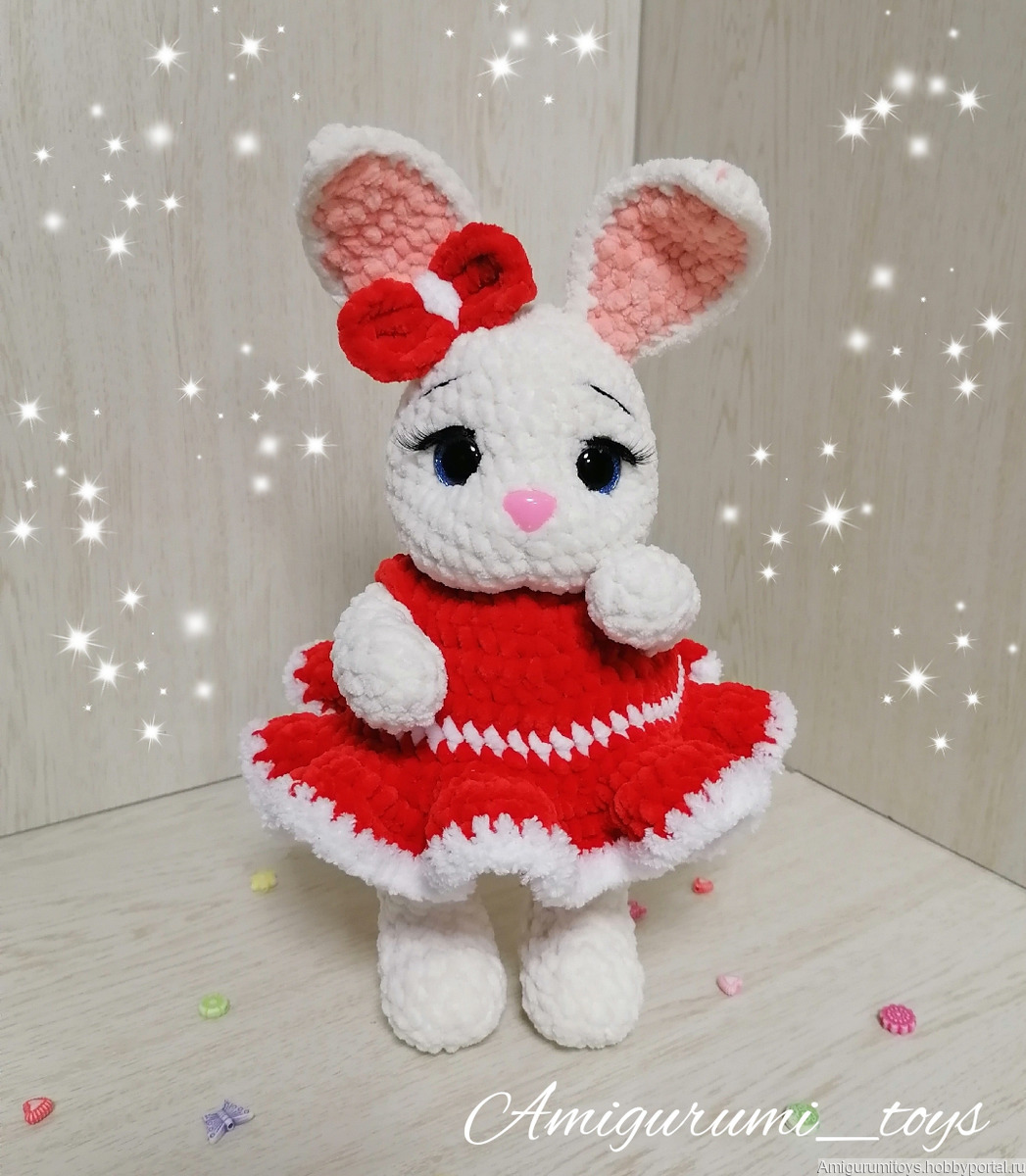 Игрушка выполнена из гипоаллергенной плюшевой пряжи, глазки и носик на безопасном креплении, наполнитель-холофайбер. Платье съёмное.