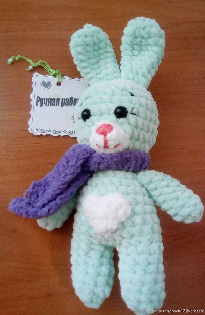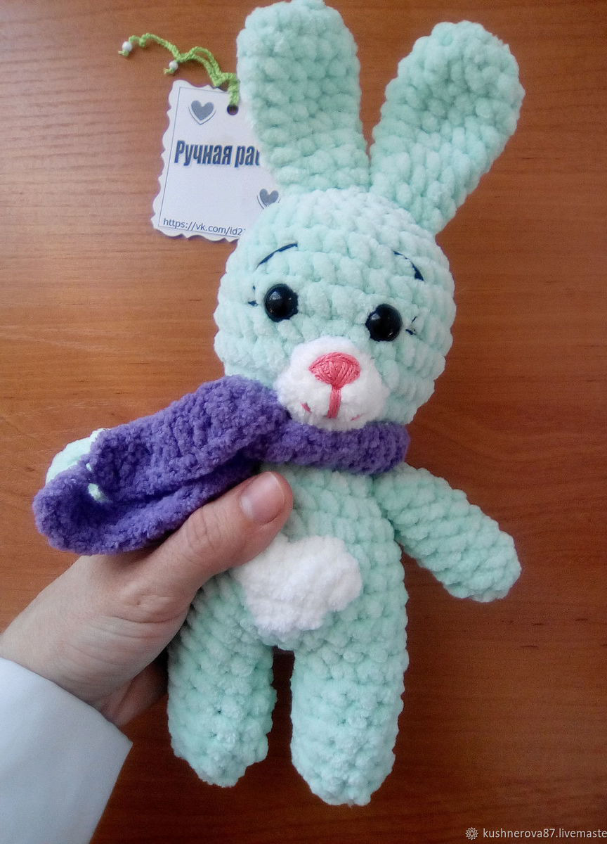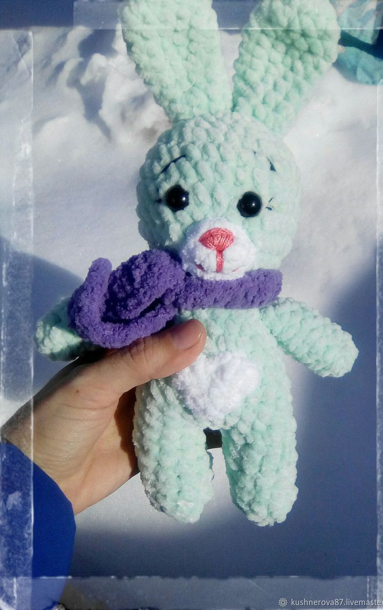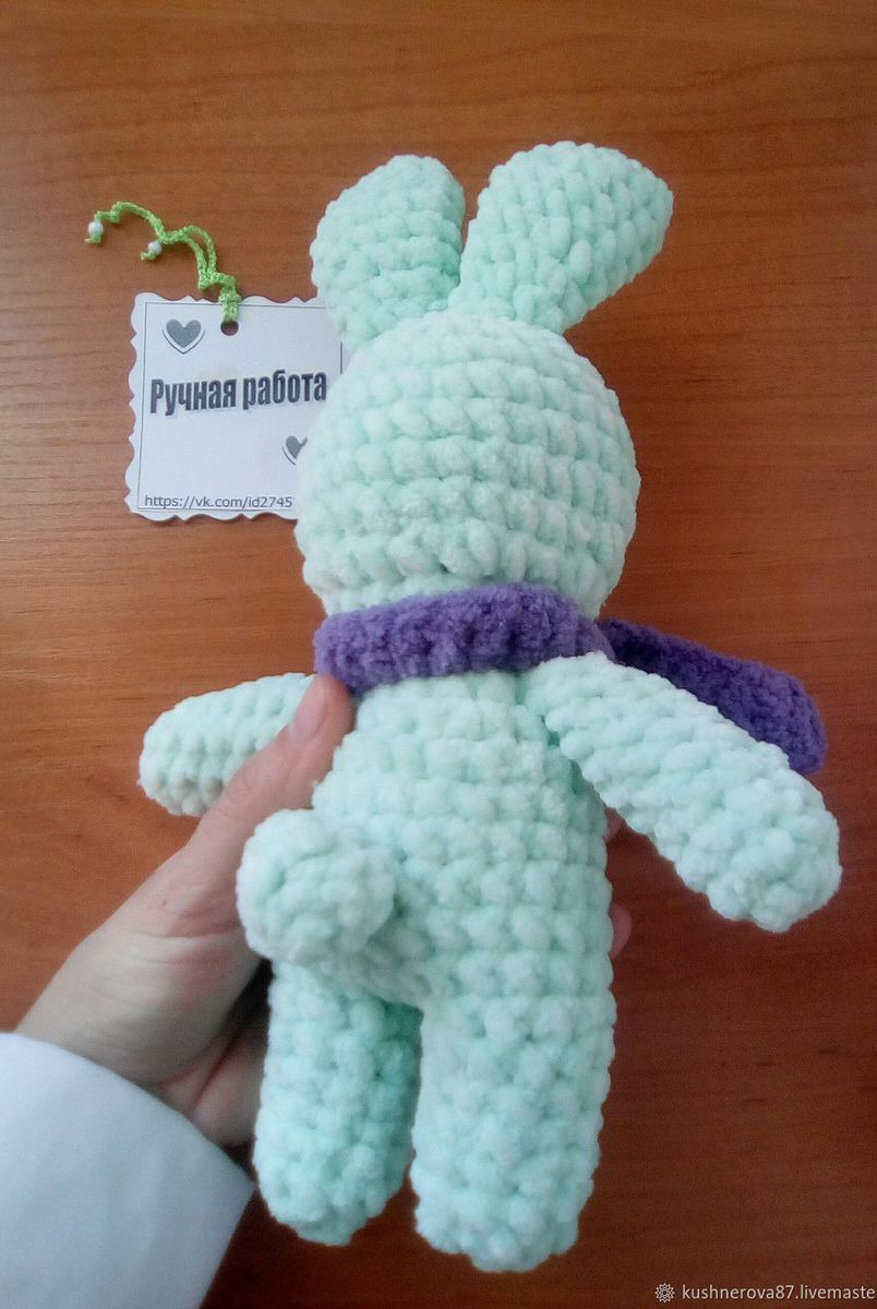 Зайка связан с добром и любовью из гипоаллергенной плюшевой пряжи. Подойдёт для самых маленьких деток. Хороший тискательный размер зайки, малышу будет удобно и комфортно с такой игрушкой.