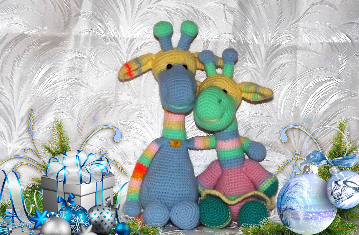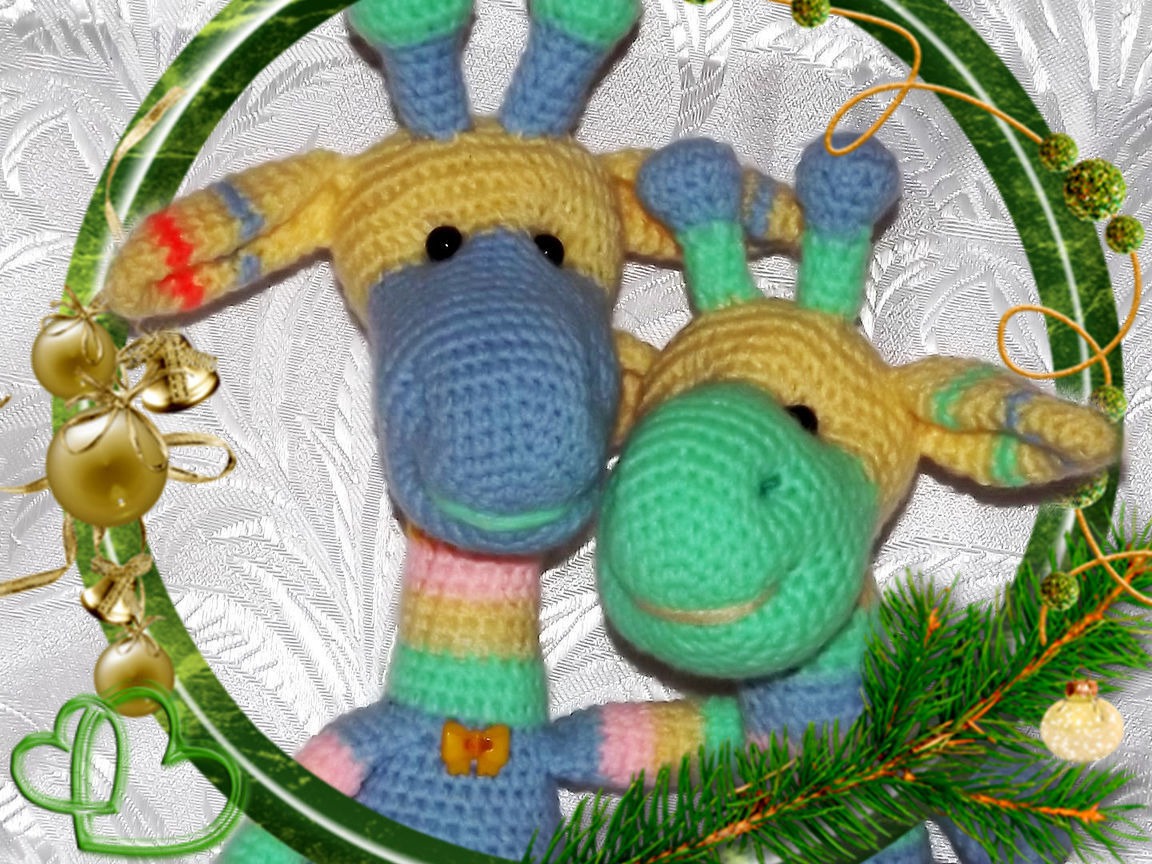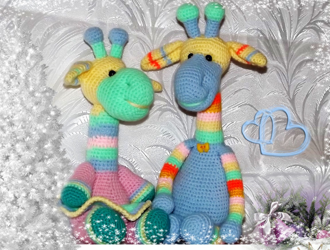 Очень яркие и веселые жирафики Жоржик и Жозефина, они радуют и дает тепло душе, совсем не опасны для деток, их приятно держать в руках)