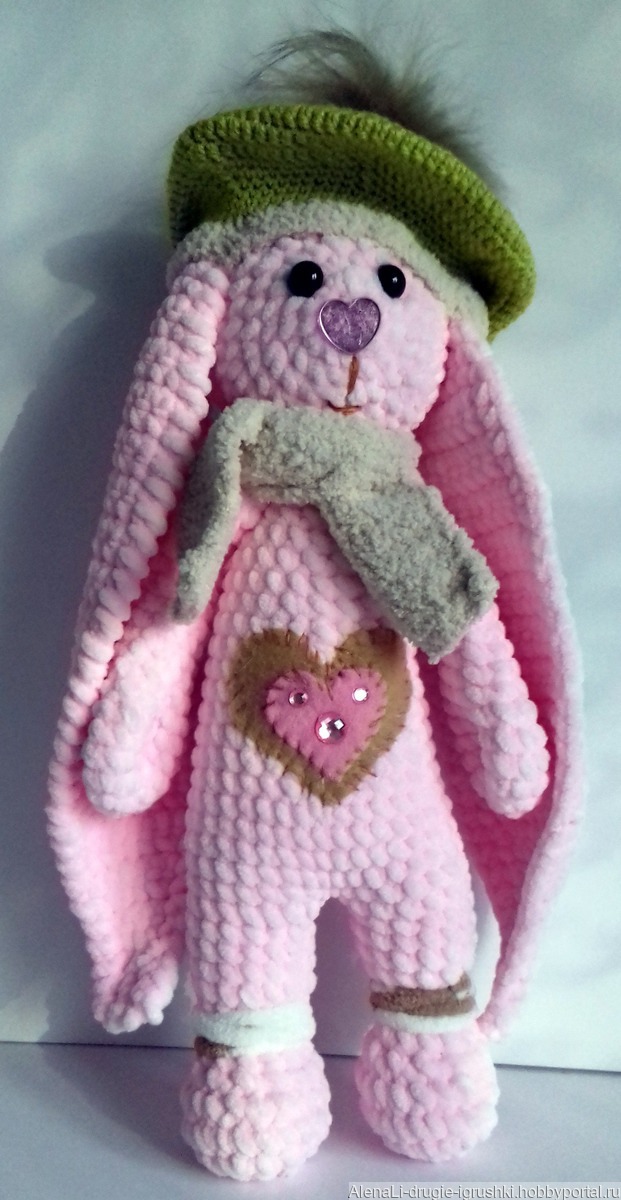 Вязаная зайка необычайно приятный на ощупь и очень мягкий. Этот очаровательный зайка понравится и ребенку и взрослому, станет приятным подарком ко дню рождения или к любому другому случаю. Игрушка выполнена из плюшевой, мягкой пряжи. Высота зайки 34 см