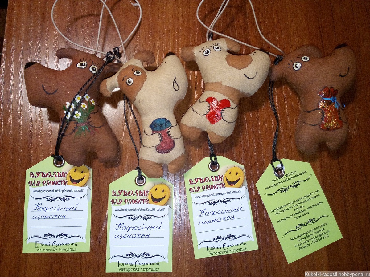 Кофейные игрушки сшиты из хлопка и пропитаны раствором кофе с добавлением корицы и ванили. Разукрашены акриловыми красками.