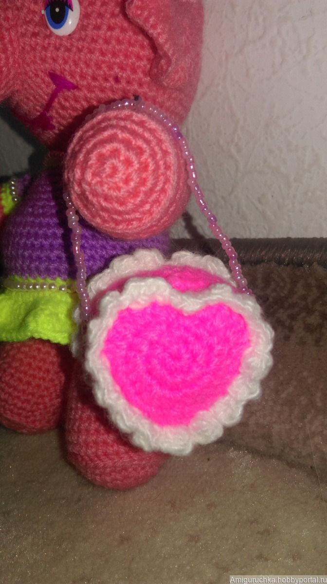 Вязанная игрушка крючком , высота - 17 см. Наполнитель гипоаллергенный синтепух.В комплект входит маленькая вязанная сумочка-сердечко.Платишко обшито бусинками.