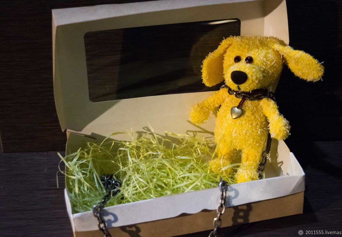 Милейшая игрушка собачка Жужа связана из фактурной пряжи, наполнитель синтепон, глазки пластиковые, носик винтовой бархатистый, ошейник связан из акрила не снимается, подвеска сердечко. Цепь только для фотосессии. Верхние лапки подвижны на нитяном креплении, умеет стоять только с опорой. Символ 2018 года. Игрушка прекрасно подойдет как сувенир к Новому году или просто подарок на любой случай.