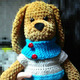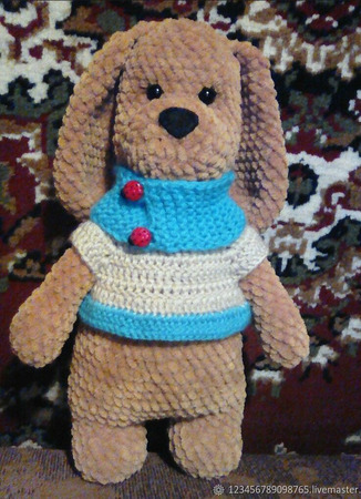 собачка связана из велюровой мягкой пряжи в одежде кофточке и шарфике