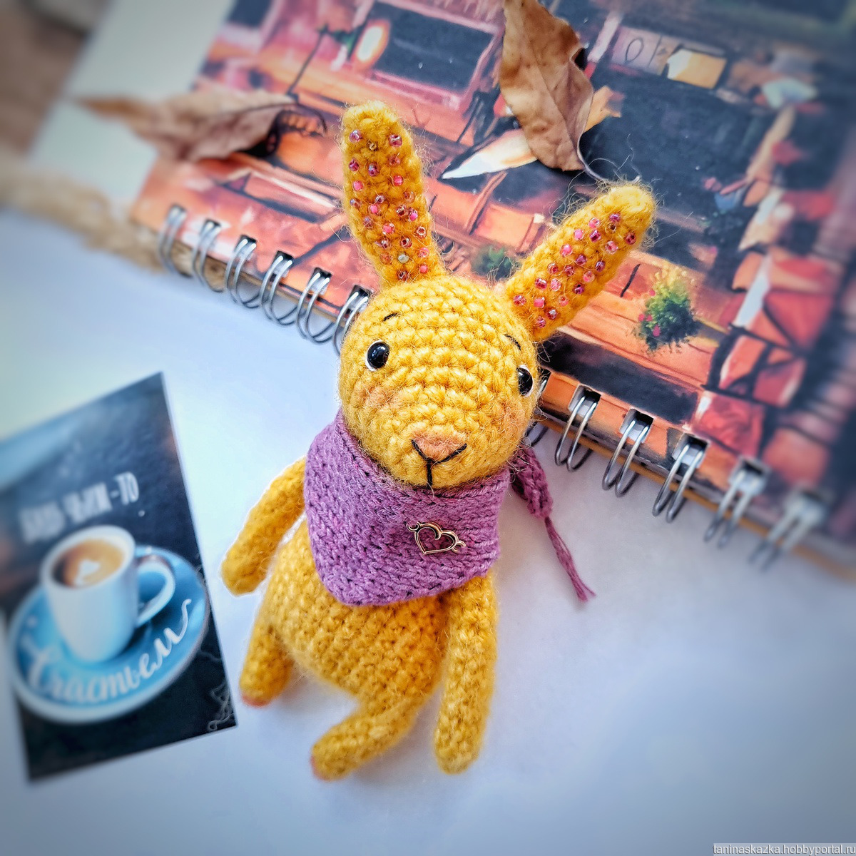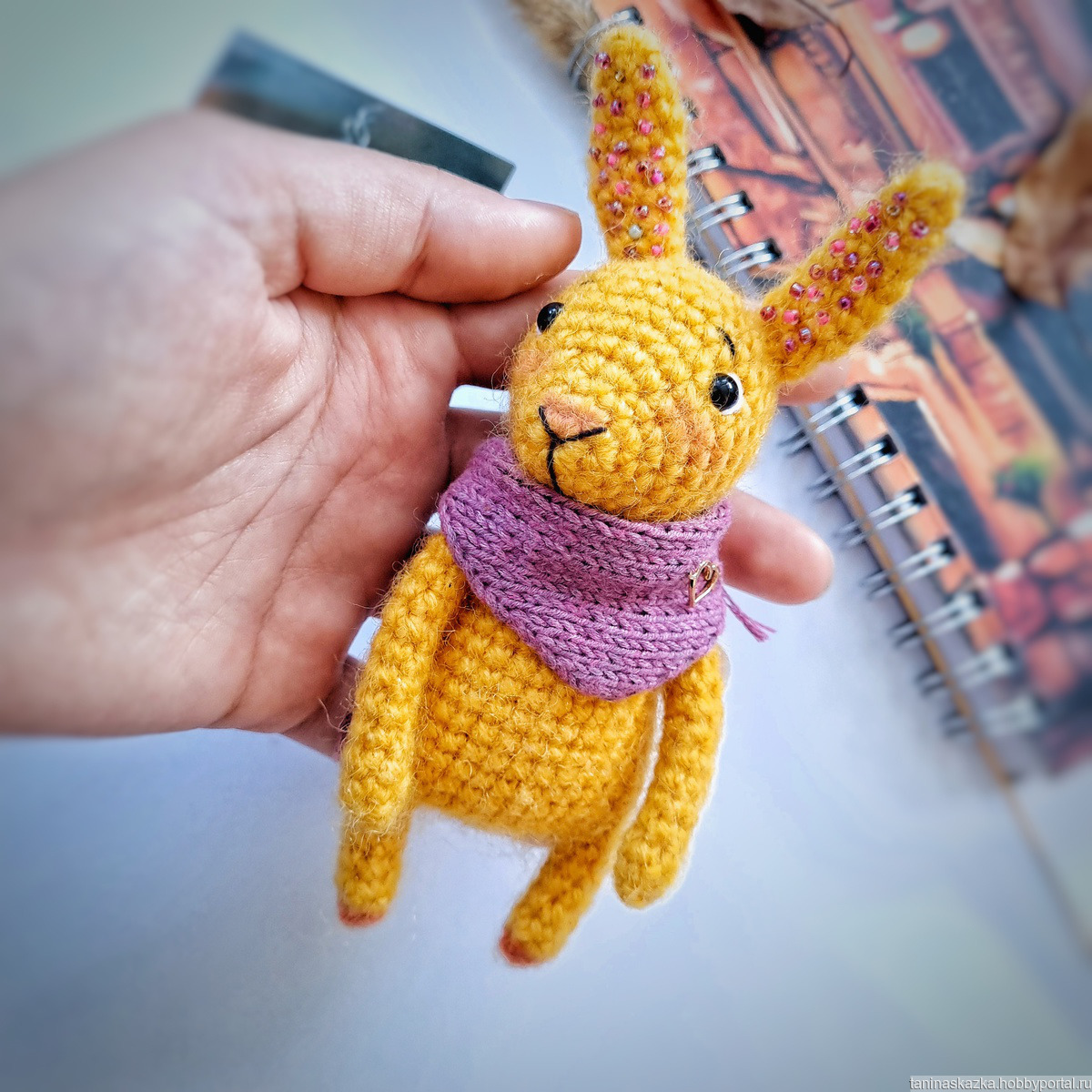 Зайчик связан из полушерстяной пряжи ангоры, уши расшиты бисером. Голова крутится на креплении, слегка тонирован пастелью. Глазки пластиковые. Шарфик снимается, связан из хлопка.