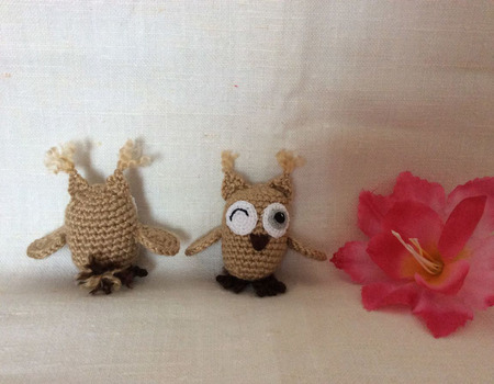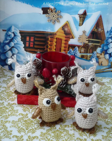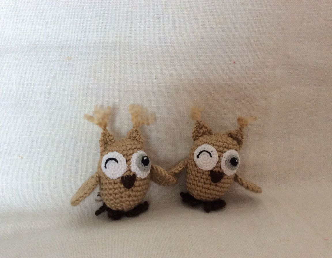 Мои совушки связаны крючком из акриловой пряжи, наполнитель холлофайбер. Рост 5-6 см. Они могут стать подвеской, их можно разместить на рабочем столе или дома.