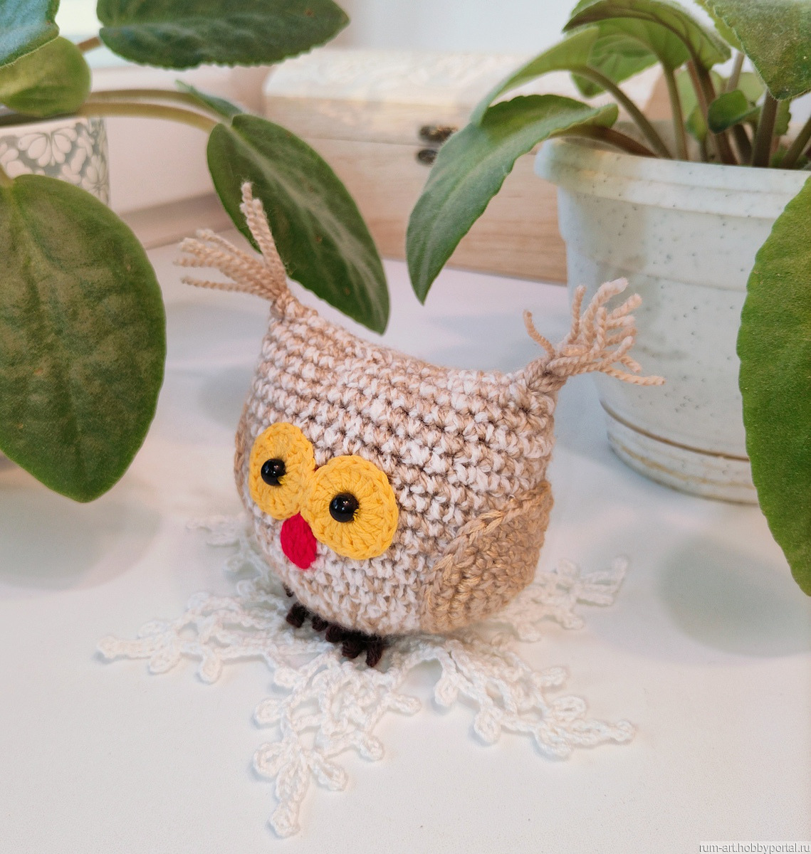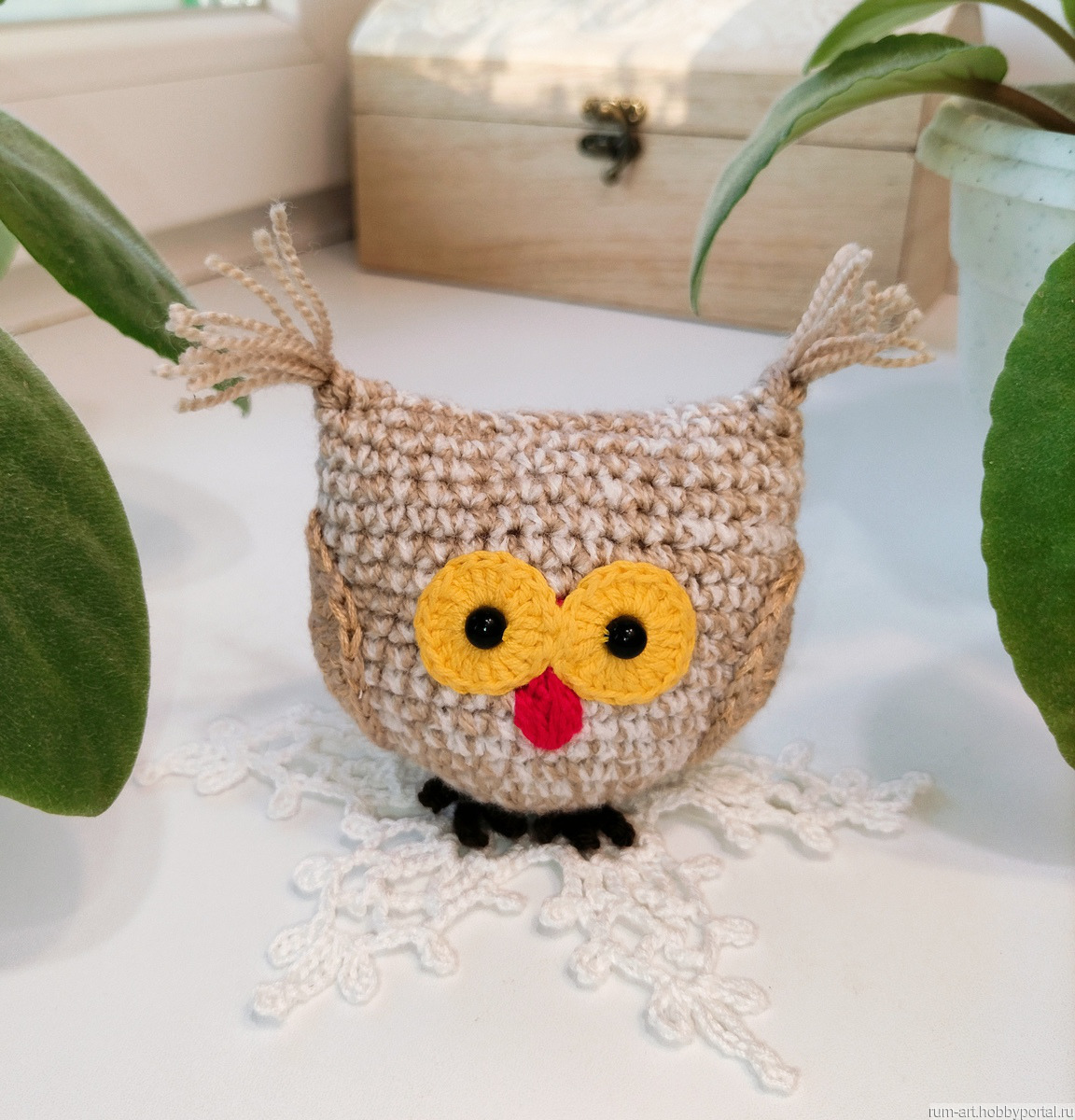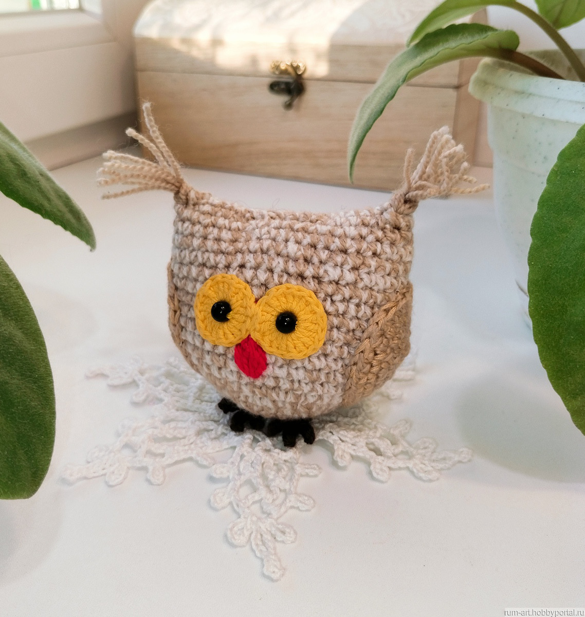 Совушка игрушка мягкая связана из пряжи акрил с хлопком. Глазки пластиковые бусины надежно пришиты. Клювик вышит пряжей.
