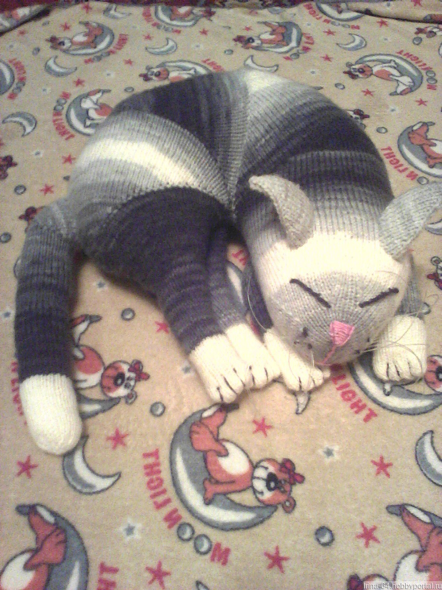 Игрушка-подушка.Вяжется на спицах.Цвет по желанию заказчика -серый с белым,рыже-коричневый-белый,черный с белым.Наполнитель-синтепон. Может быть выполнен с открытыми глазами.