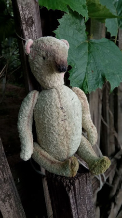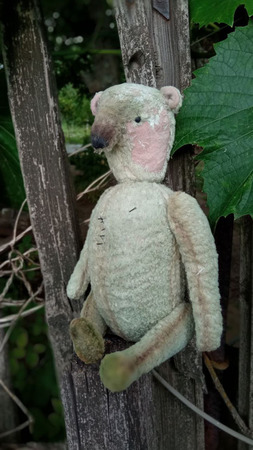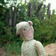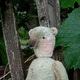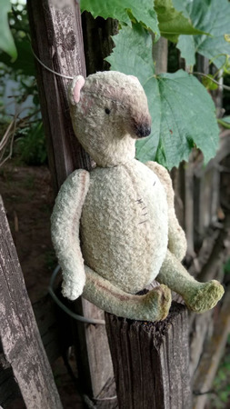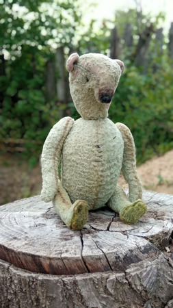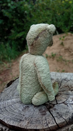 Сшит из плюша, набит опилками, в животике немного гранулята. Искусственно состарен, протонирован масляными красками.