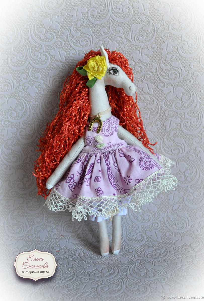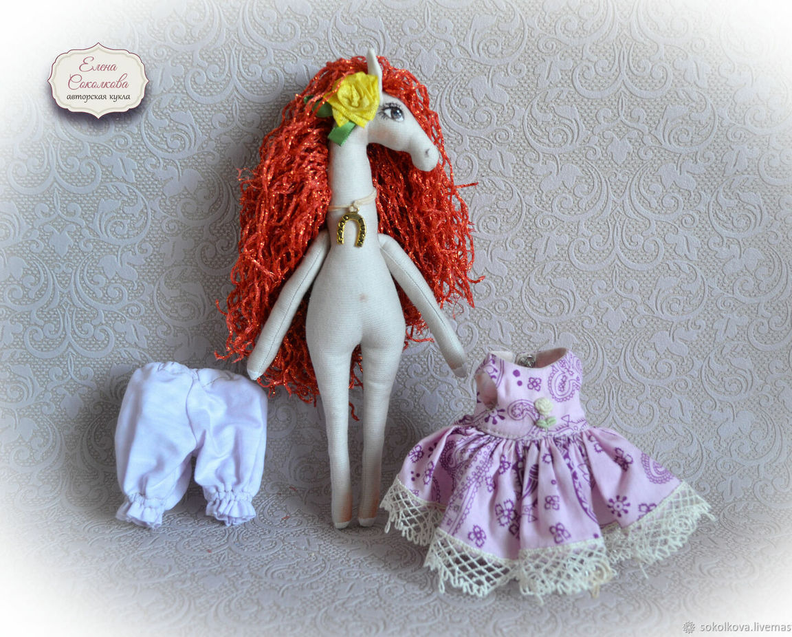 Одёжка - платьице и панталончики снимаются, грива выполнена из пряжи, глазки нарисованы акриловыми красками и покрыты акриловым лаком.