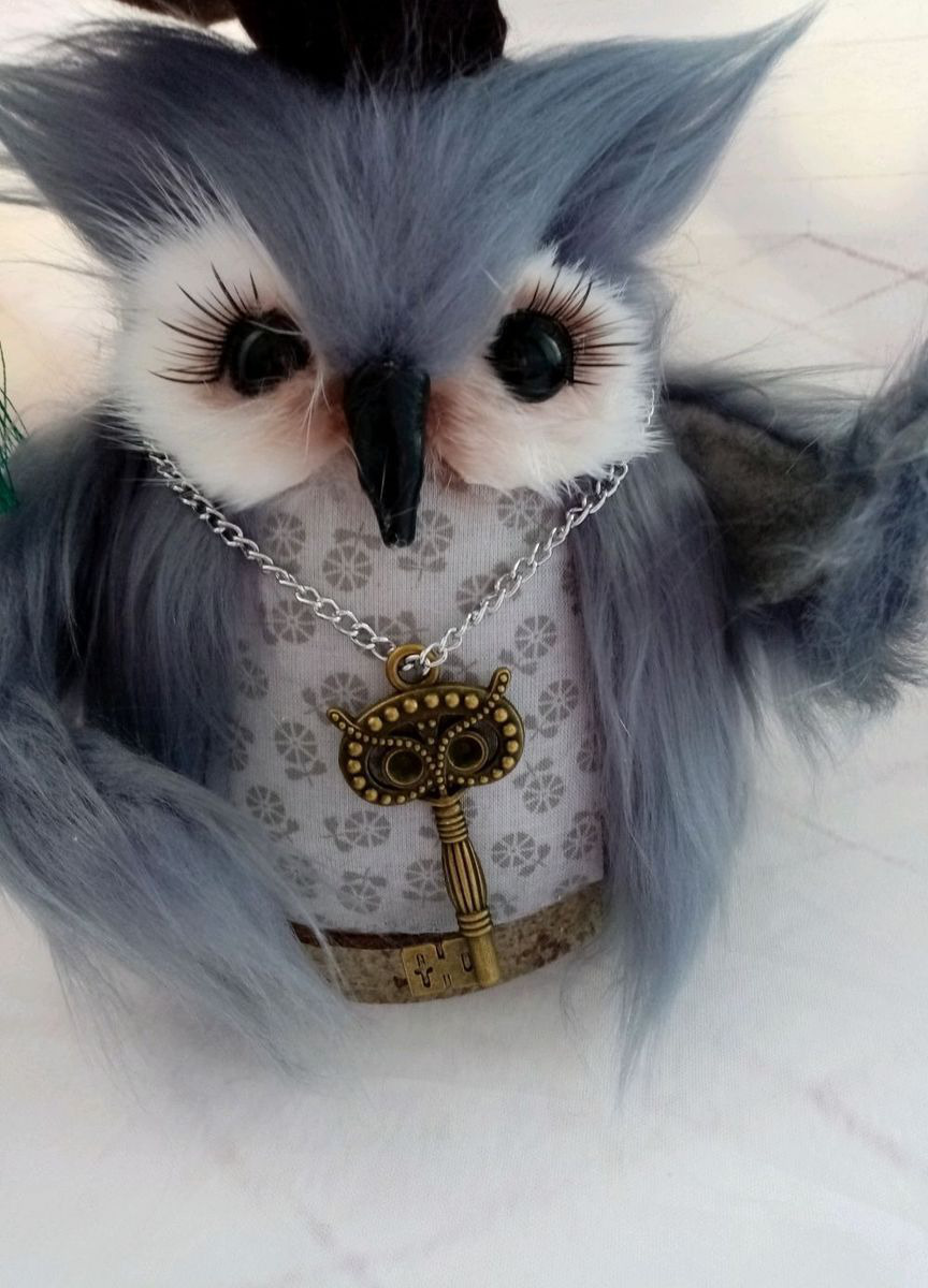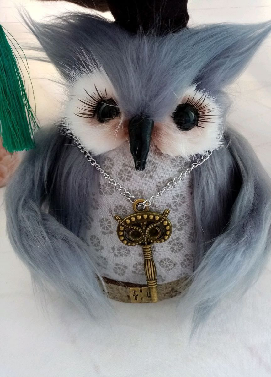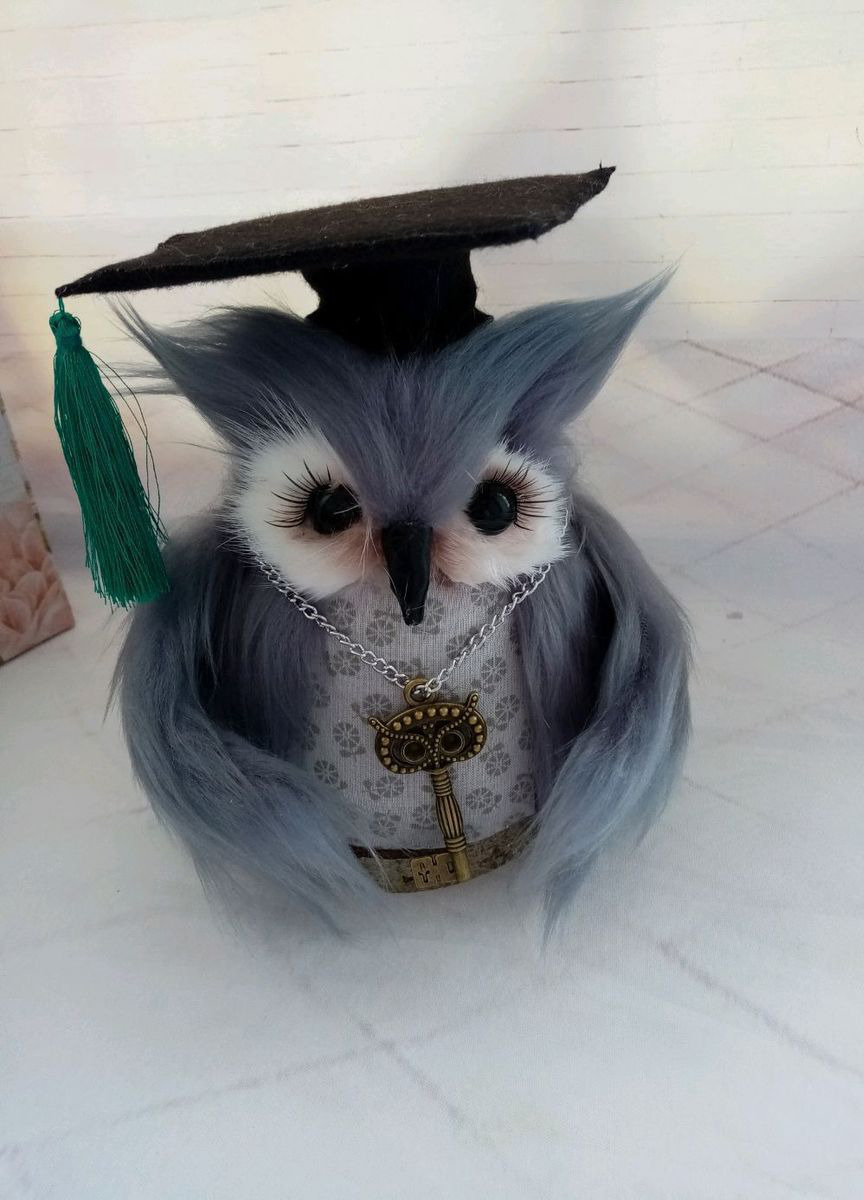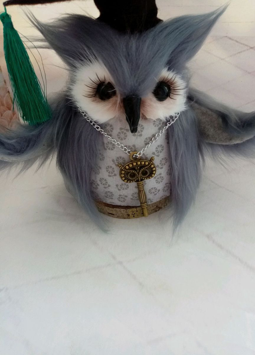 Совушка сделана из искусственного меха в сочетании с хлопком. Клюв - кожщам, подглащники - натуральная норка. Крылья на каркасе, могут принимать любую форму. Шапочка с кисточкой. Шапочка из фетра. Совушка закреплена на подставке. Подставка - срез натурального дерева!
