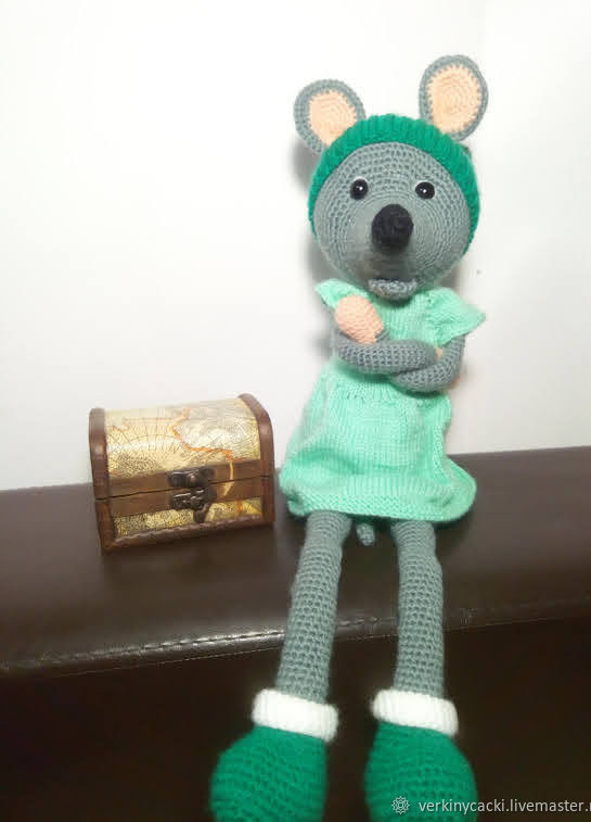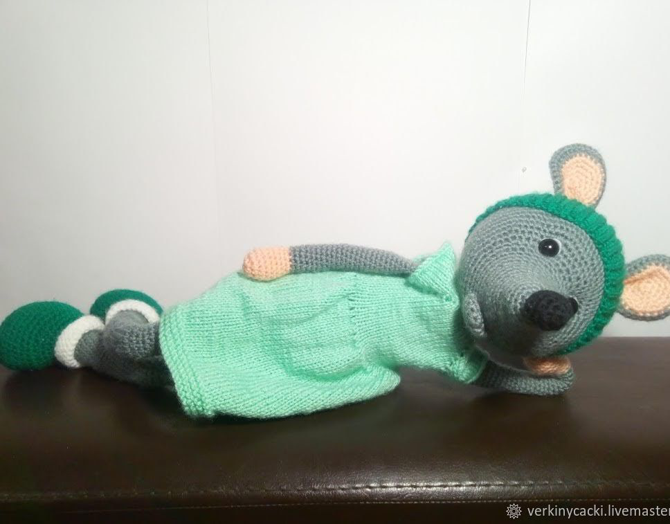 Мышка имеет рост 46 сантиметров и выполнена из акриловой пряжи, что делает её мягкой и приятной на ощупь. Наполнитель - синтипух - делает игрушку еще более мягкой. Мышка имеет безопасные глазки.
