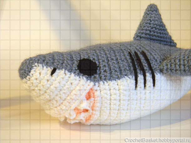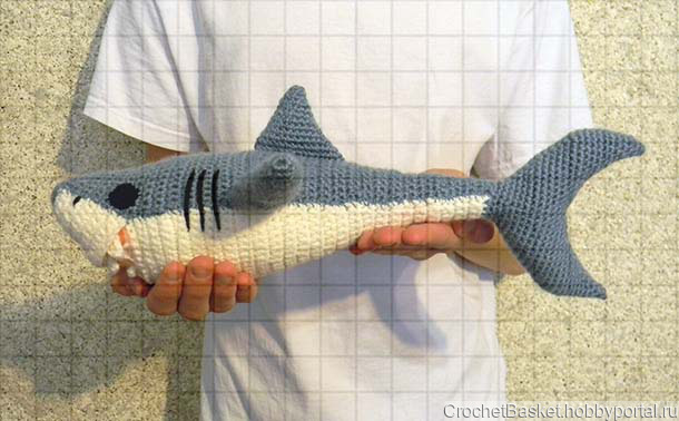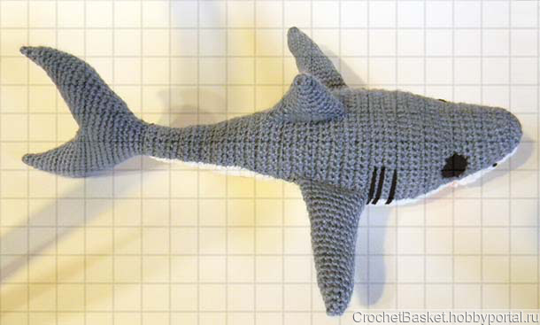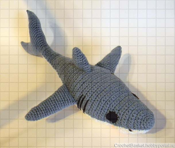 Акула выполнена из акриловой пряжи, набита холлофайбером. Длина рыбы 41 см, размах плавников 28 см, масса 120 г.