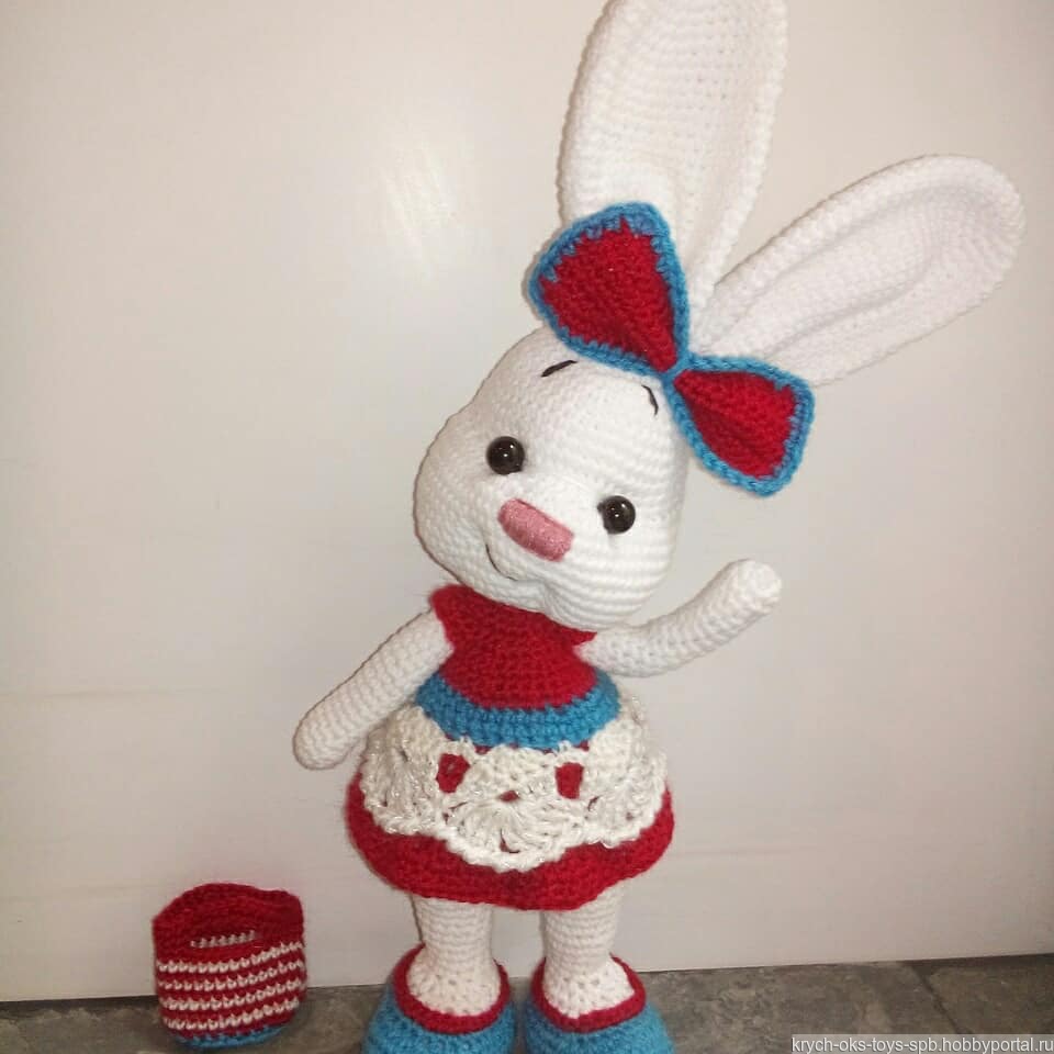 Связана крючком из полухлопковой пряжи, внутри проволочный каркас, рост с ушами 33 сантиметра.