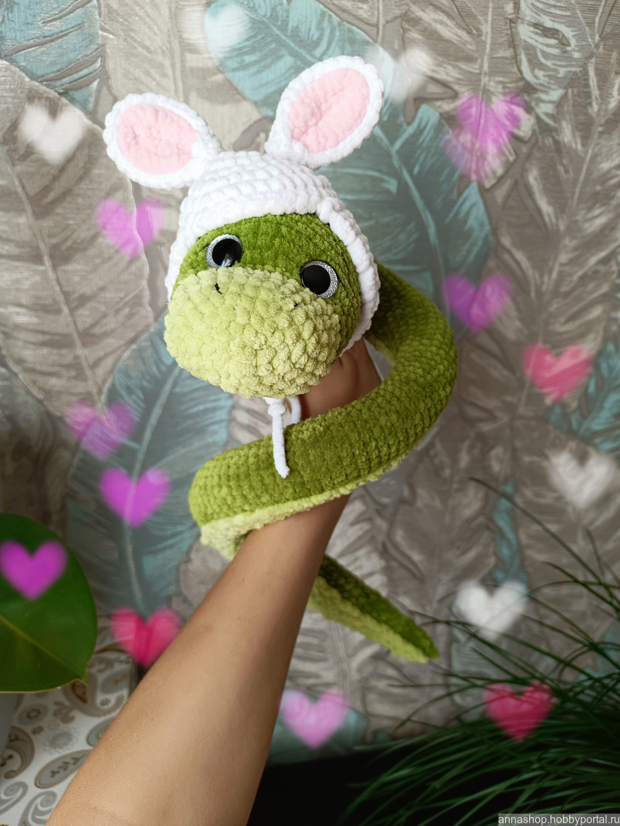 Милая вязаная змея в шапочке зайки, внутри проволочный каркас, длина 64см