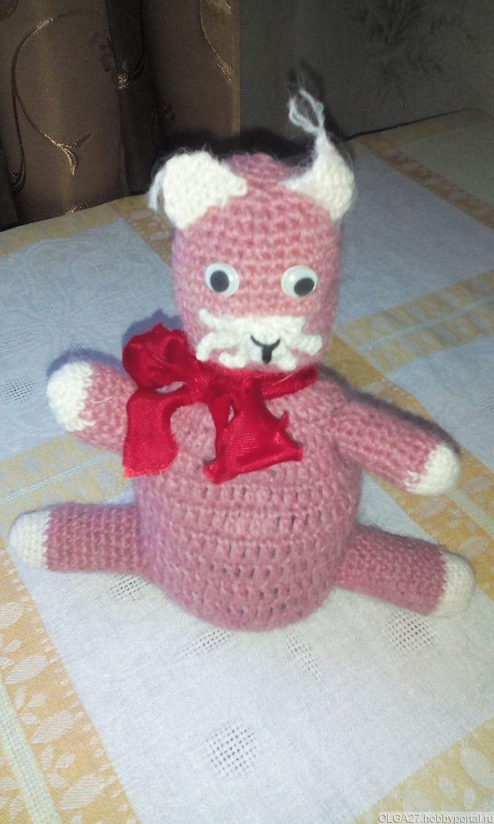 вязанный котик с бантиком, развивает моторику пальчиков ребенка