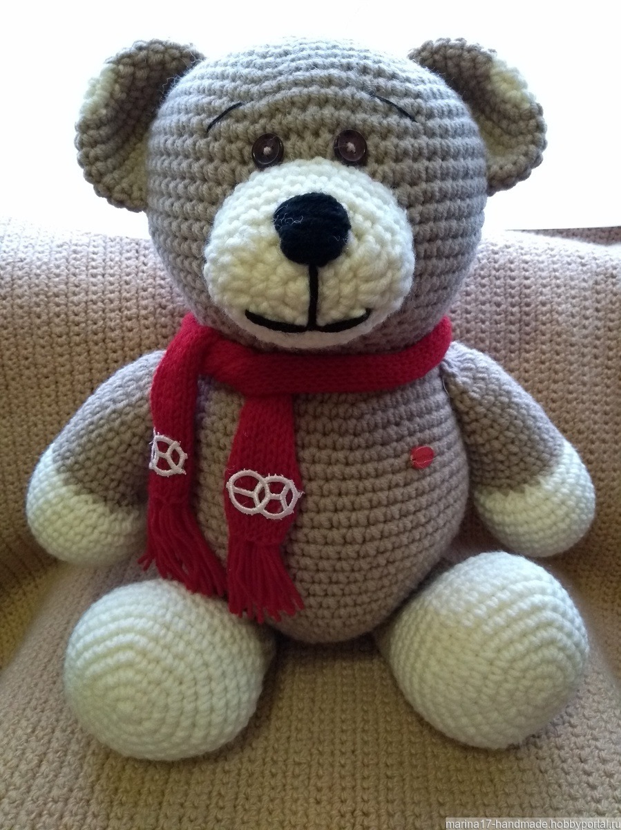 мишка размер 55см, из пряжи п/ш Ализе, наполнитель халлофайбер.Выполнен в бежевом цвете,белая мордочка и кончики лап,глазки пришиты,носик и бровки вышиты.Голова-туловище связаны совместно, на шее красный шарф. Лапки на ниточном креплении