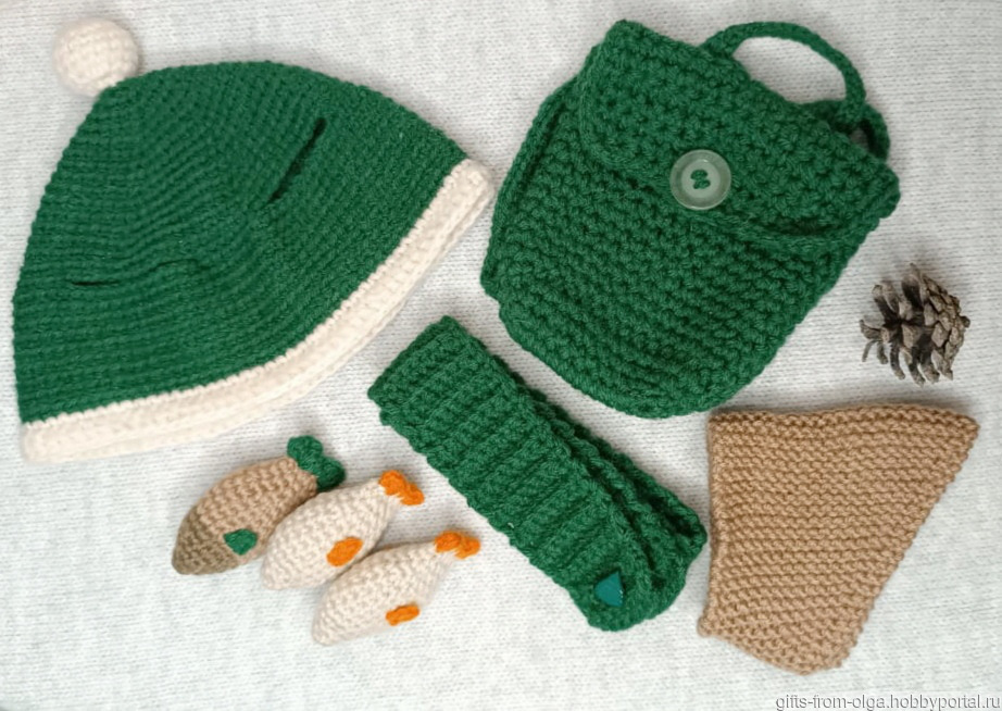бактус, шапочка, шарфик, рюкзачок, 3 рыбки