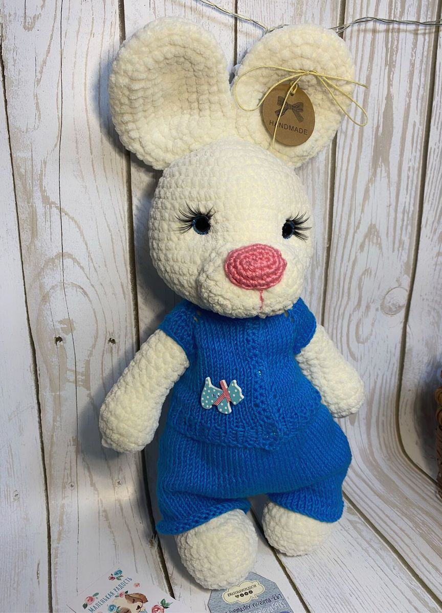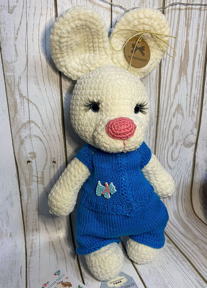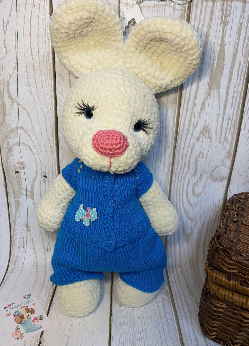 Заяц связан из плюшевой пряжи. Глазки на безопасном креплении. Одежда снимается. Подойдёт для деток любого возраста и станет отличным подарком.