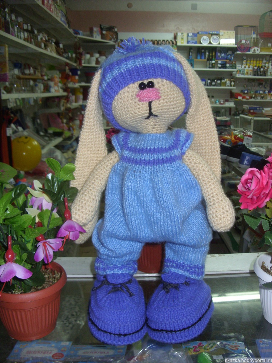 Зайчик связан крючком,одежда спицами.Рост 32 см ручки и ножки подвижные,стоит и сидит самостоятельно.Подойдёт как игрушка для детей,подарок и как просто украшение интерьера.Нитки Семёновская пряжа-"Каролина" 100% акрил, наполнитель-синтепон.