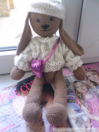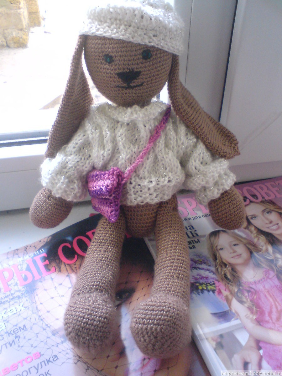 Зайка связан из акрила .Рост 25 см.Ножки ,ручки двигаются.Мордочка вышита.Одежда снимается.