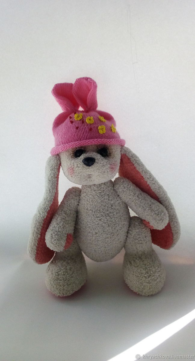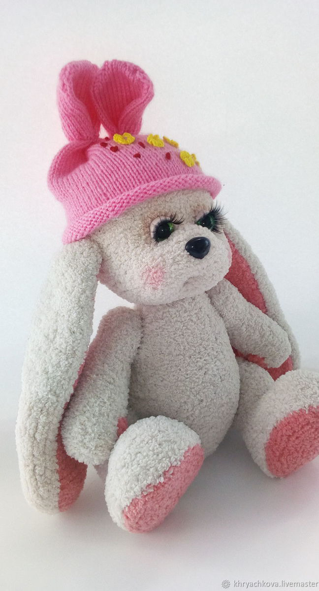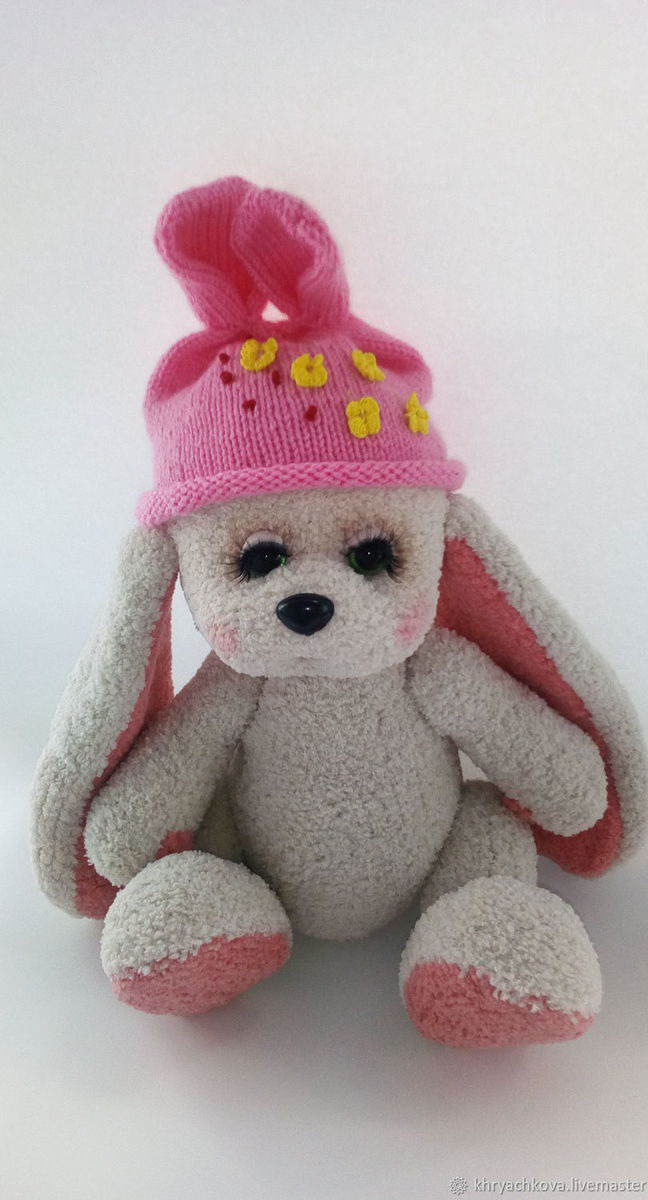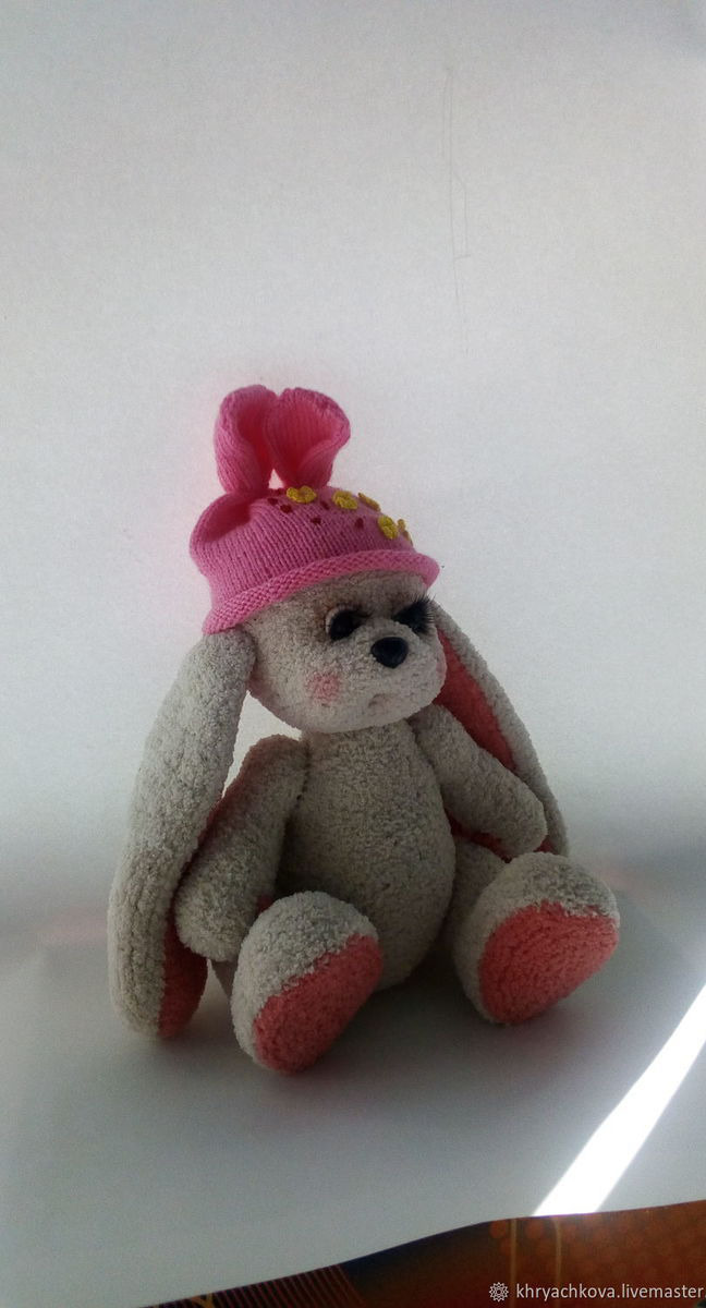 Зайка связан из мягкой плюшевой пряжи спицами. Самостоятельно не стоит. Ножки ручки подвижные.