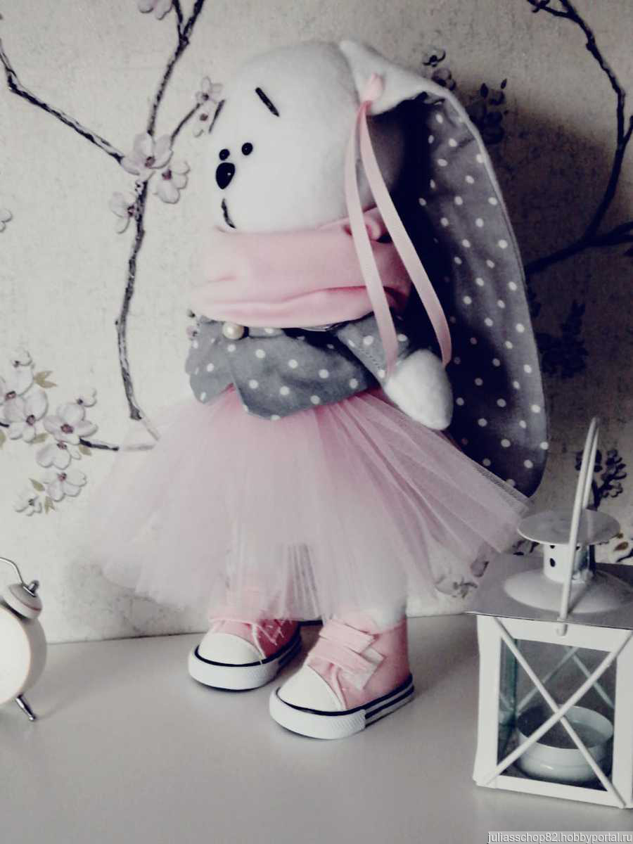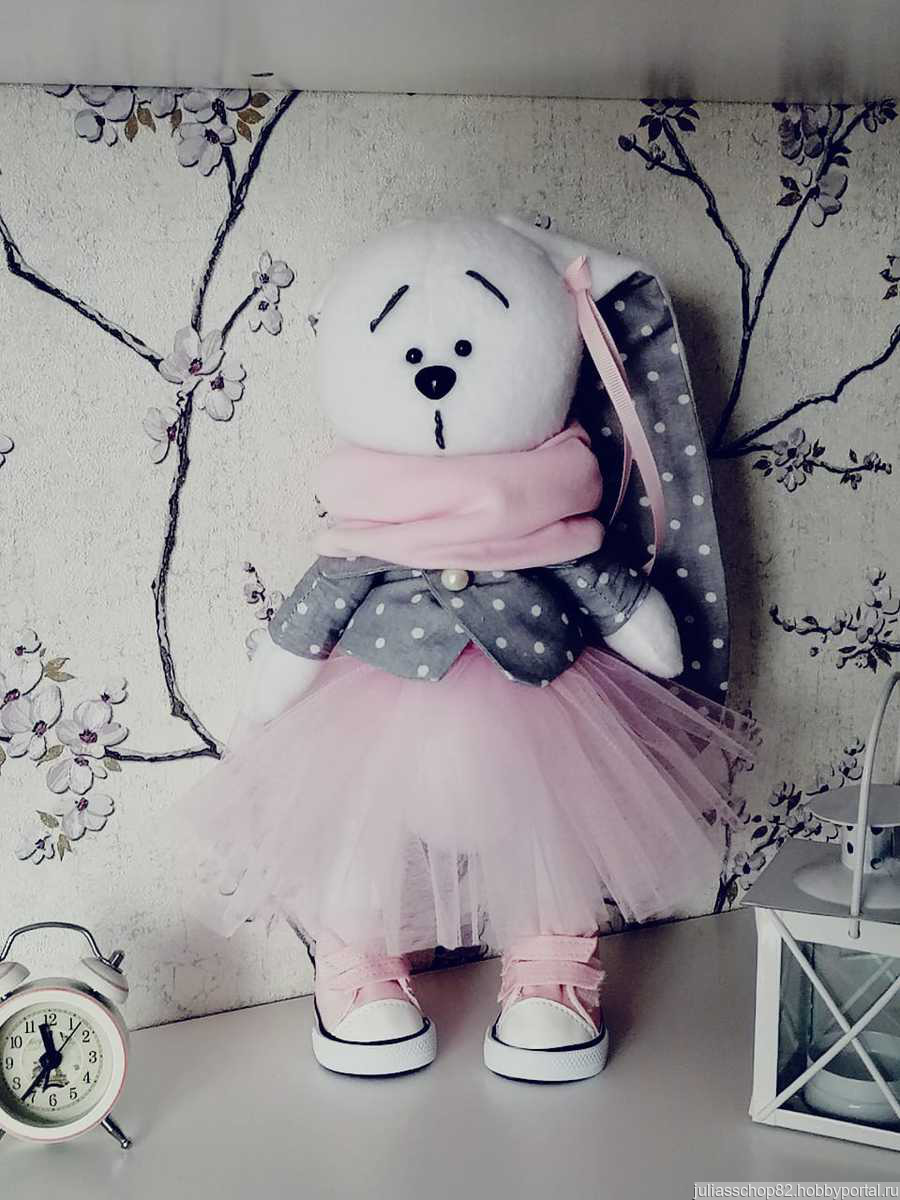 Милый зайка из плюша составит компанию хорошенькой хозяйке.