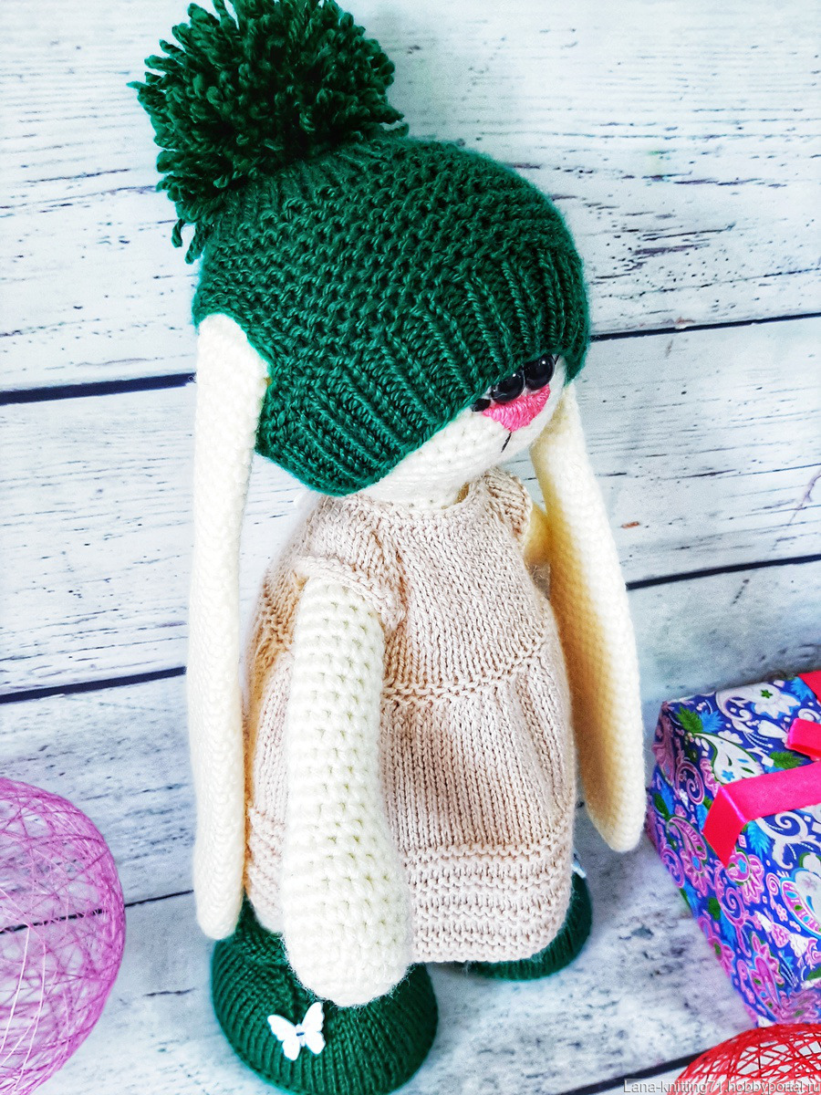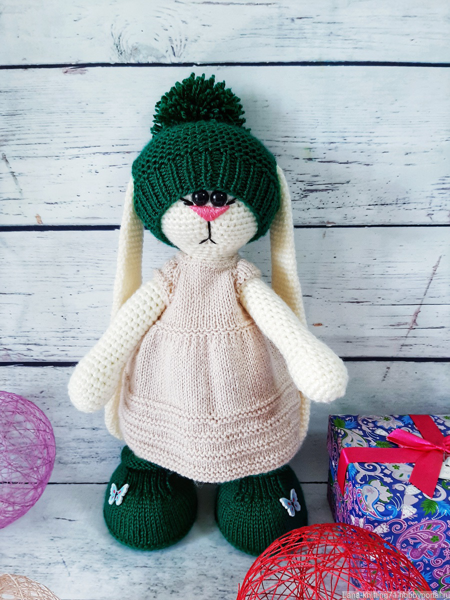 Зайка связана из гипоаллергенной пряжи, глазки на безопасном креплении, ручки и ножки подвижные, вся одежда снимается. Рост около 35см.