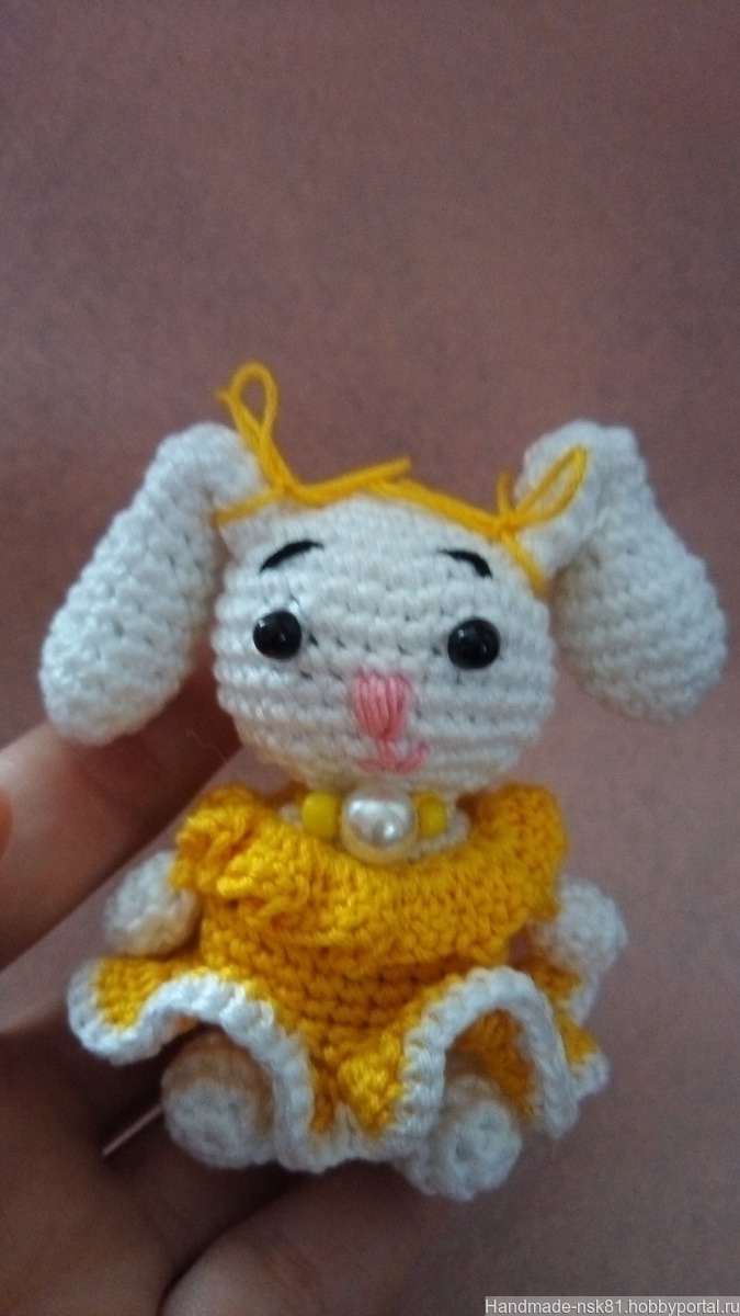 Милая зайка, всего 7см, сидит. Можно использовать как брелок. Платье не снимается. Глазки на безопасном креплении.